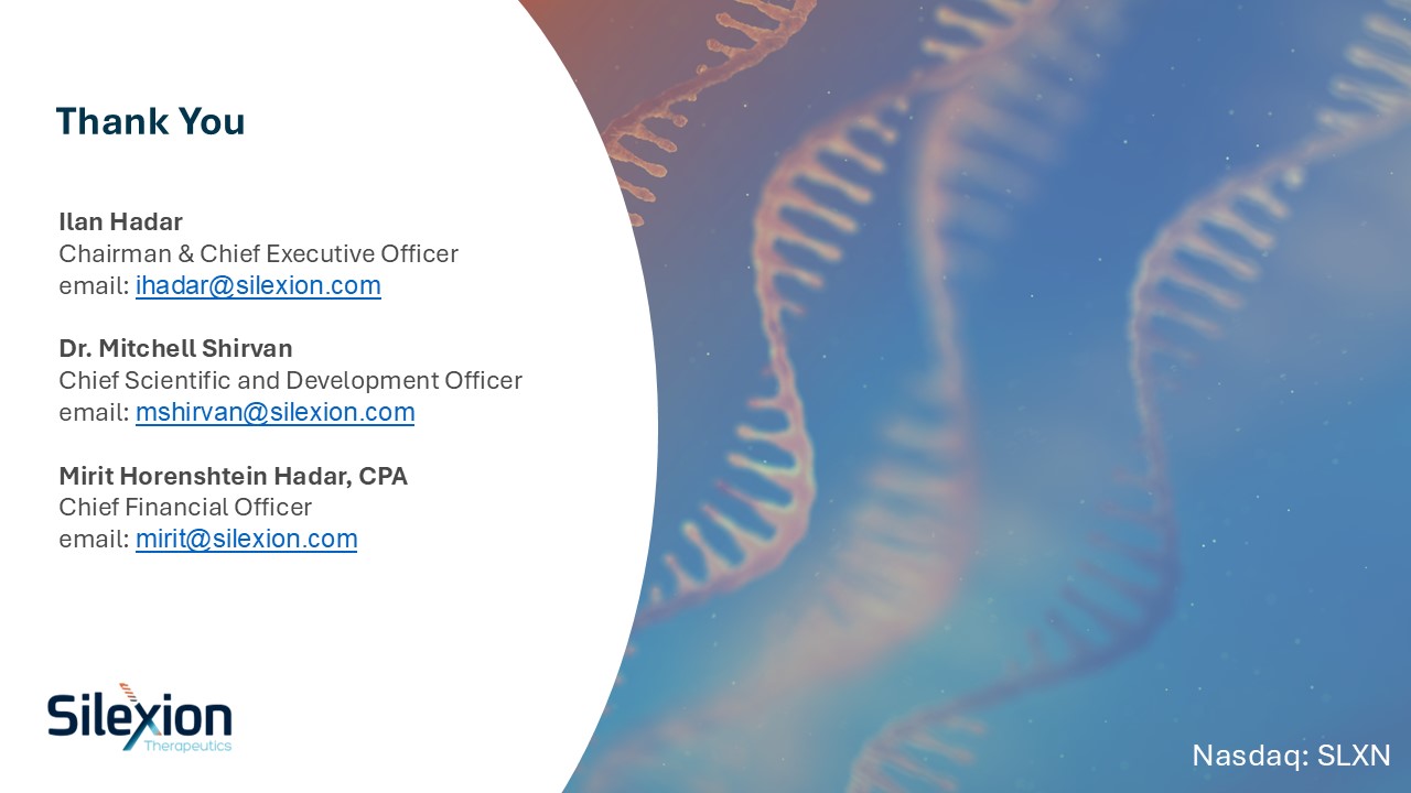 Thank You  Nasdaq: SLXN  Ilan Hadar   Chairman & Chief Executive Officer  email: ihadar@silexion.com  Dr. Mitchell Shirvan  Chief Scientific and Development Officer  email: mshirvan@silexion.com  Mirit Horenshtein Hadar, CPA  Chief Financial Officer  email: mirit@silexion.com