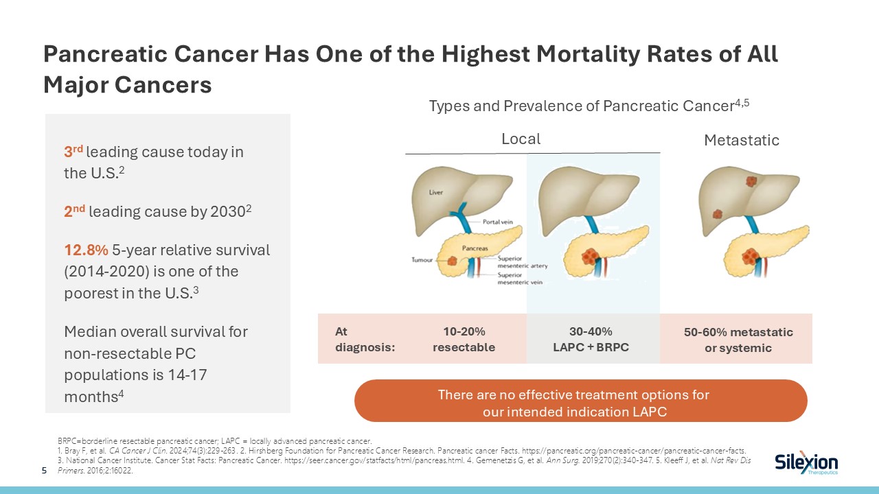 Pancreatic Cancer Has One of the Highest Mortality Rates of All Major Cancers  BRPC=borderline resectable pancreatic cancer; LAPC = locally advanced pancreatic cancer.   1. Bray F, et al. CA Cancer J Clin. 2024;74(3):229-263. 2. Hirshberg Foundation for Pancreatic Cancer Research. Pancreatic cancer Facts. https://pancreatic.org/pancreatic-cancer/pancreatic-cancer-facts. 3. National Cancer Institute. Cancer Stat Facts: Pancreatic Cancer. https://seer.cancer.gov/statfacts/html/pancreas.html. 4. Gemenetzis G, et al. Ann Surg. 2019;270(2):340-347. 5. Kleeff J, et al. Nat Rev Dis Primers. 2016;2:16022.   Local  Metastatic  At diagnosis:  10-20% resectable  30-40% LAPC + BRPC  50-60% metastatic or systemic  Types and Prevalence of Pancreatic Cancer4,5  5   There are no effective treatment options for our intended indication LAPC   3rd leading cause today in the U.S.2  2nd leading cause by 20302  12.8% 5-year relative survival (2014-2020) is one of the poorest in the U.S.3  Median overall survival for non-resectable PC populations is 14-17 months4