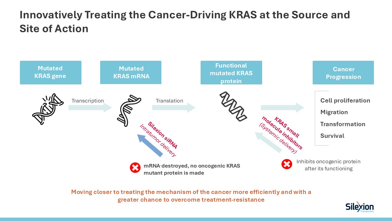 Innovatively Treating the Cancer-Driving KRAS at the Source and Site of Action  Moving closer to treating the mechanism of the cancer more efficiently and with a greater chance to overcome treatment-resistance  Cell proliferation  Migration  Transformation   Survival  Silexion siRNA  Intratumor delivery  KRAS small molecule inhibitors (Systemic delivery)  Functional mutated KRAS protein   Mutated KRAS mRNA  Cancer   Progression  Mutated   KRAS gene  Inhibits oncogenic protein after its functioning  Transcription  Translation  mRNA destroyed, no oncogenic KRAS mutant protein is made