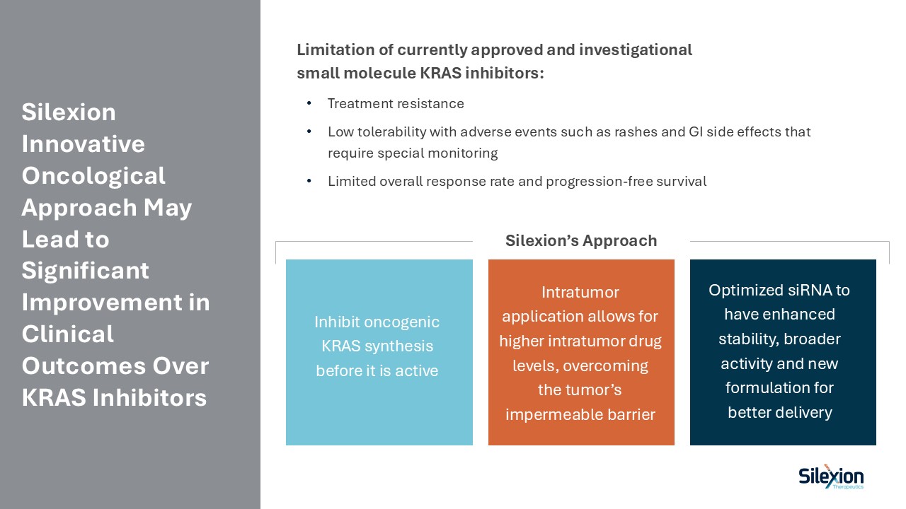 Silexion Innovative Oncological Approach May Lead to Significant Improvement in Clinical Outcomes Over KRAS Inhibitors   Treatment resistance  Low tolerability with adverse events such as rashes and GI side effects that require special monitoring   Limited overall response rate and progression-free survival  Limitation of currently approved and investigational small molecule KRAS inhibitors:  Inhibit oncogenic KRAS synthesis before it is active   Intratumor application allows for higher intratumor drug levels, overcoming the tumor’s impermeable barrier  Optimized siRNA to have enhanced stability, broader activity and new formulation for better delivery  Silexion’s Approach