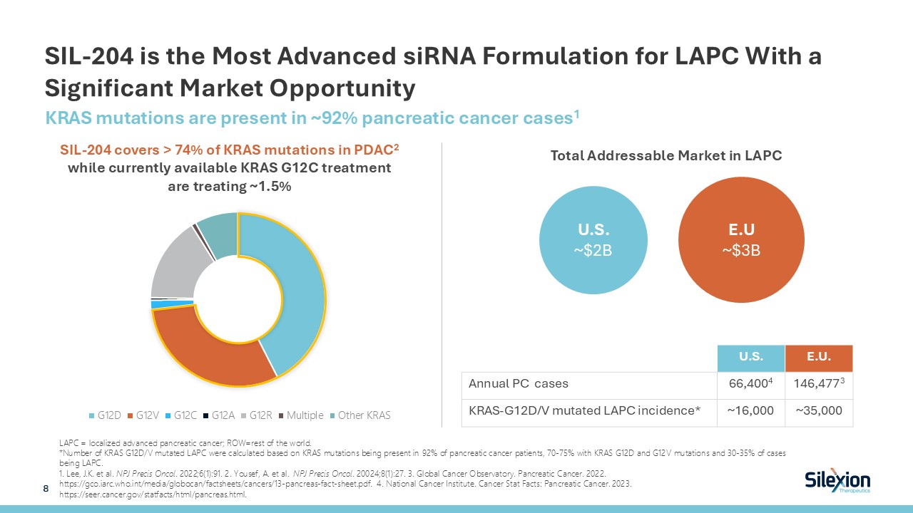 SIL-204 is the Most Advanced siRNA Formulation for LAPC With a Significant Market Opportunity  KRAS mutations are present in ~92% pancreatic cancer cases1  LAPC = localized advanced pancreatic cancer; ROW=rest of the world.  *Number of KRAS G12D/V mutated LAPC were calculated based on KRAS mutations being present in 92% of pancreatic cancer patients, 70-75% with KRAS G12D and G12V mutations and 30-35% of cases being LAPC.  1. Lee, J.K. et al. NPJ Precis Oncol. 2022;6(1):91. 2. Yousef, A. et al. NPJ Precis Oncol. 20024;8(1):27. 3. Global Cancer Observatory. Pancreatic Cancer. 2022. https://gco.iarc.who.int/media/globocan/factsheets/cancers/13-pancreas-fact-sheet.pdf. 4. National Cancer Institute. Cancer Stat Facts: Pancreatic Cancer. 2023. https://seer.cancer.gov/statfacts/html/pancreas.html.   SIL-204 covers > 74% of KRAS mutations in PDAC2 while currently available KRAS G12C treatment are treating ~1.5%  Total Addressable Market in LAPC  U.S.  E.U.  Annual PC cases  66,4004  146,4773  KRAS-G12D/V mutated LAPC incidence*  ~16,000  ~35,000  8   U.S. ~$2B  E.U ~$3B