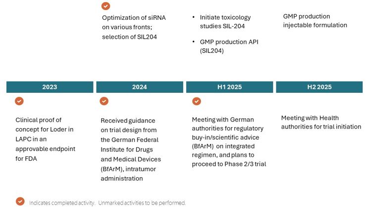 Based on the promising clinical and preclinical data and as part of the expanded development plan, Silexion has established a clear development pathway for SIL204. Building on the Phase 2 clinical results from its first-generation product (siG12DLoder) and the recent orthotopic model studies showing SIL204's ability to reduce metastases, the Company plans to conduct additional toxicology and pharmacodynamic studies throughout the remainder of 2025, followed by potential regulatory submissions to the Israel Ministry of Health in H2 2025 and to the European Union in H1 2026. These submissions would initiate the next stage of clinical development for SIL204 in patients with advanced localized KRAS-driven pancreatic cancer.