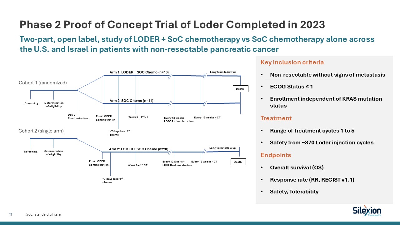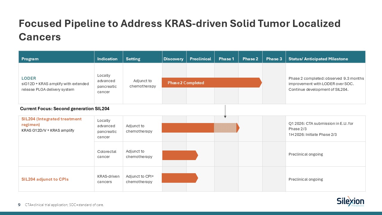 Program  Indication   Setting  Discovery  Preclinical  Phase 1  Phase 2  Phase 3  Status/ Anticipated Milestone  LODER  siG12D + KRAS amplify with extended release PLGA delivery system  Locally advanced pancreatic cancer  Adjunct to chemotherapy  Phase 2 completed: observed 9.3 months improvement with LODER over SOC.  Continue development of SIL204.  SIL204 (Integrated treatment regimen)  KRAS G12D/V + KRAS amplify  Locally advanced pancreatic cancer  Adjunct to chemotherapy  Q1 2026: CTA submission in E.U. for Phase 2/31H 2026: Initiate Phase 2/3  Colorectal cancer  Adjunct to chemotherapy  Preclinical ongoing  SIL204 adjunct to CPIs  KRAS-driven cancers   Adjunct to CPI+ chemotherapy   Preclinical ongoing  Focused Pipeline to Address KRAS-driven Solid Tumor Localized Cancers  9   CTA=clinical trial application; SOC=standard of care.  Phase 2 Completed   Current Focus: Second generation SIL204