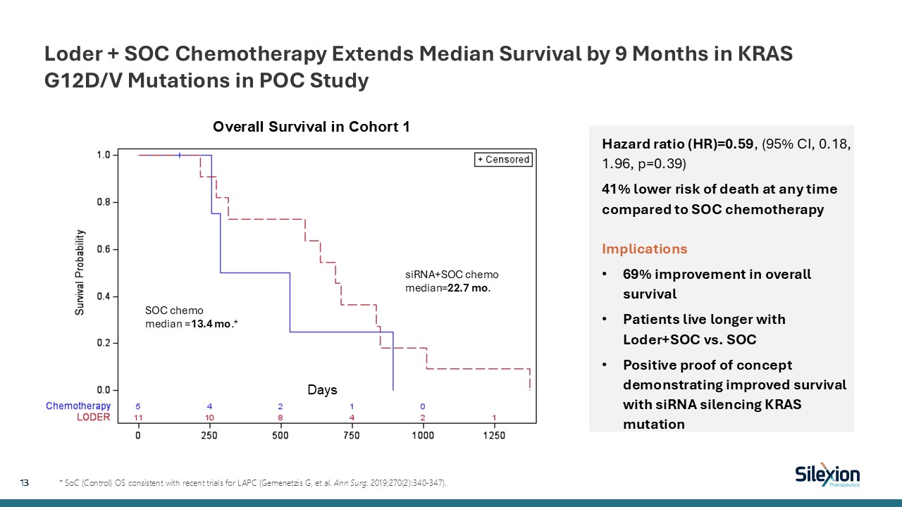 Loder + SOC Chemotherapy Extends Median Survival by 9 Months in KRAS G12D/V Mutations in POC Study  13   * SoC (Control) OS consistent with recent trials for LAPC (Gemenetzis G, et al. Ann Surg. 2019;270(2):340-347).  Hazard ratio (HR)=0.59, (95% CI, 0.18, 1.96, p=0.39)  41% lower risk of death at any time compared to SOC chemotherapyImplications  69% improvement in overall survival  Patients live longer with Loder+SOC vs. SOC  Positive proof of concept demonstrating improved survival with siRNA silencing KRAS mutation  Days  Overall Survival in Cohort 1  SOC chemo median =13.4 mo.*  siRNA+SOC chemo median=22.7 mo.