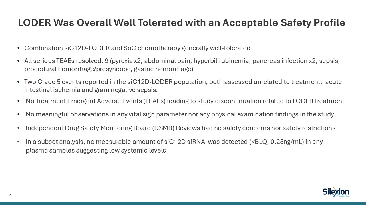 LODER Was Overall Well Tolerated with an Acceptable Safety Profile  Combination siG12D-LODER and SoC chemotherapy generally well-tolerated   All serious TEAEs resolved: 9 (pyrexia x2, abdominal pain, hyperbilirubinemia, pancreas infection x2, sepsis, procedural hemorrhage/presyncope, gastric hemorrhage)   Two Grade 5 events reported in the siG12D-LODER population, both assessed unrelated to treatment: acute intestinal ischemia and gram negative sepsis.   No Treatment Emergent Adverse Events (TEAEs) leading to study discontinuation related to LODER treatment   No meaningful observations in any vital sign parameter nor any physical examination findings in the study   Independent Drug Safety Monitoring Board (DSMB) Reviews had no safety concerns nor safety restrictions  In a subset analysis, no measurable amount of siG12D siRNA was detected (<BLQ, 0.25ng/mL) in any plasma samples suggesting low systemic levels  14