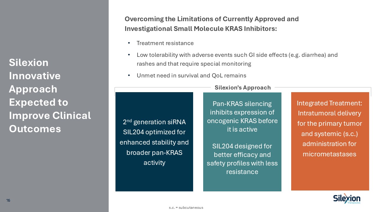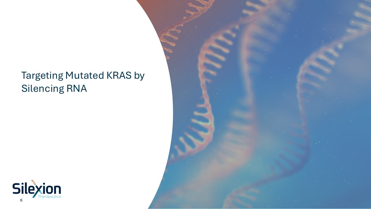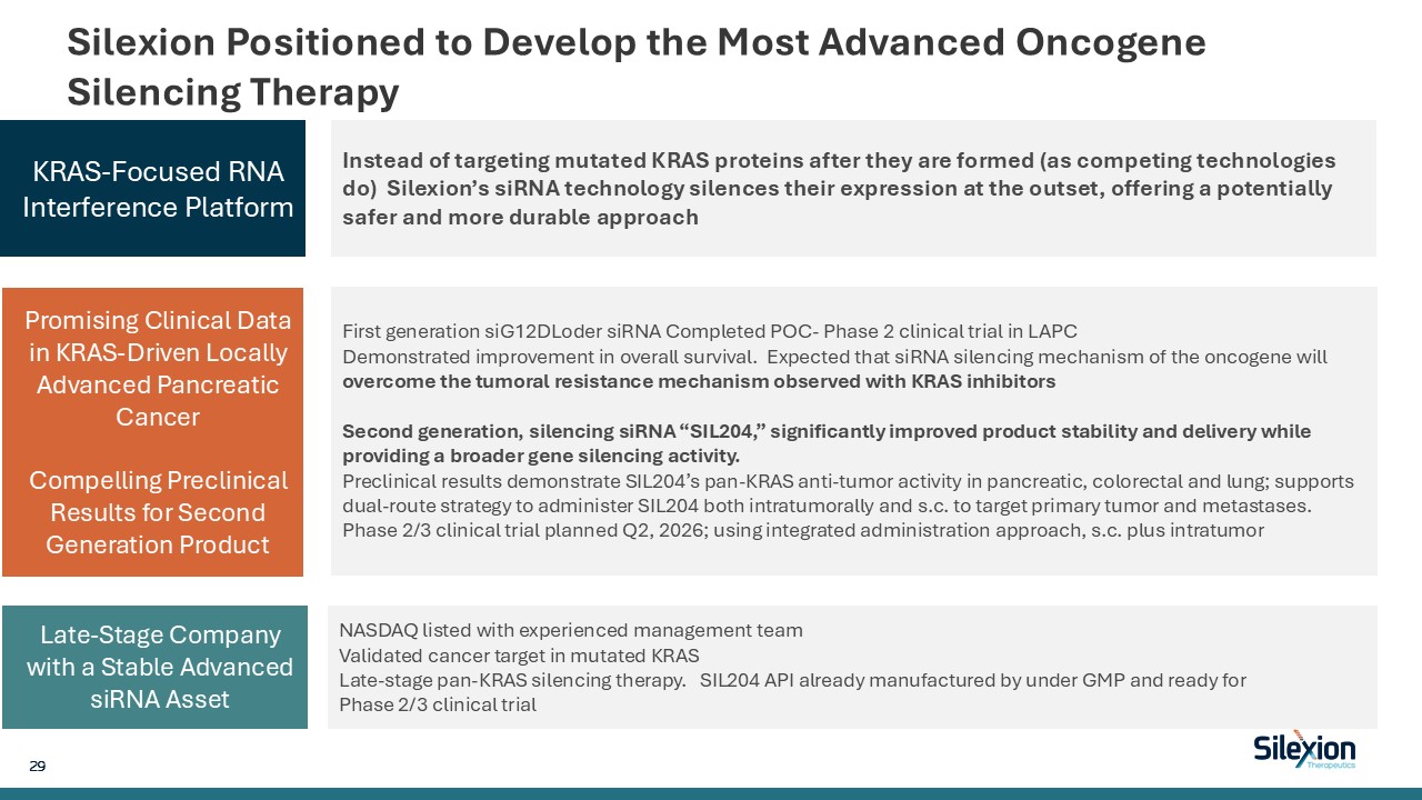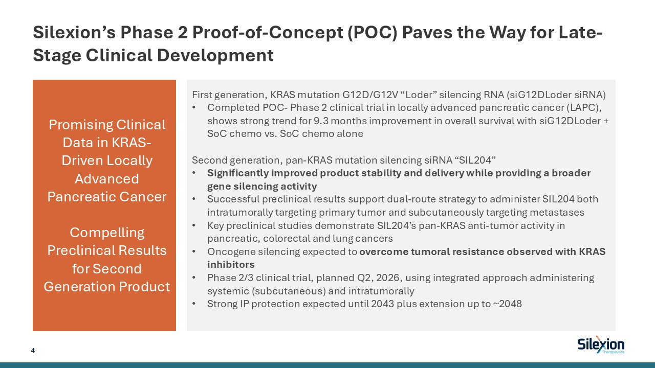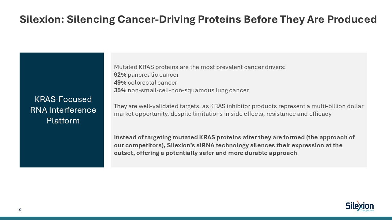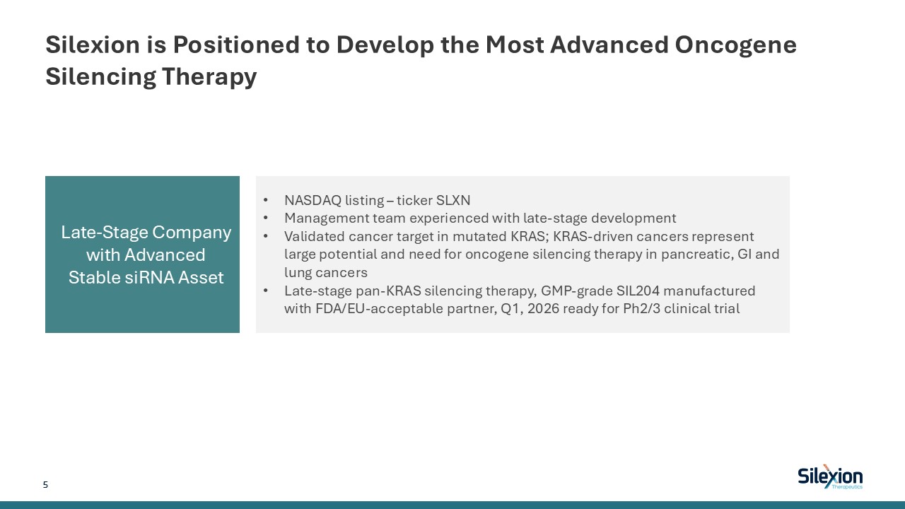 Silexion is Positioned to Develop the Most Advanced Oncogene Silencing Therapy  NASDAQ listing – ticker SLXN  Management team experienced with late-stage development  Validated cancer target in mutated KRAS; KRAS-driven cancers represent large potential and need for oncogene silencing therapy in pancreatic, GI and lung cancers  Late-stage pan-KRAS silencing therapy, GMP-grade SIL204 manufactured with FDA/EU-acceptable partner, Q1, 2026 ready for Ph2/3 clinical trial  Late-Stage Company with Advanced Stable siRNA Asset  5