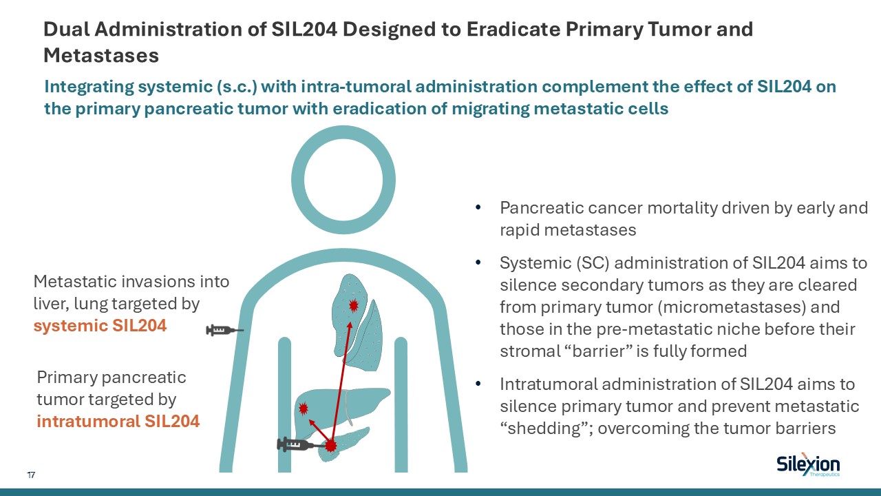 Silexion Innovative Approach Expected to Improve Clinical Outcomes  Treatment resistance  Low tolerability with adverse events such GI side effects (e.g. diarrhea) and rashes and that require special monitoring   Unmet need in survival and QoL remains  Overcoming the Limitations of Currently Approved and Investigational Small Molecule KRAS Inhibitors:  2nd generation siRNA SIL204 optimized for enhanced stability and broader pan-KRAS activity  Integrated Treatment: Intratumoral delivery for the primary tumor and systemic (s.c.) administration for micrometastases  Pan-KRAS silencing inhibits expression of oncogenic KRAS before it is active   SIL204 designed for better efficacy and safety profiles with less resistance  Silexion’s Approach  s.c. = subcutaneous  16