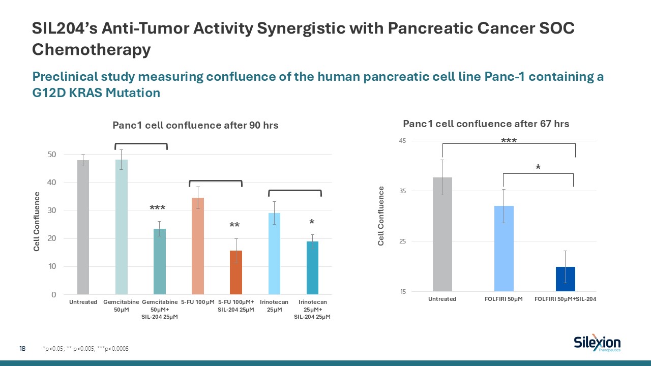 SIL204’s Anti-Tumor Activity Synergistic with Pancreatic Cancer SOC Chemotherapy  *p<0.05; ** p<0.005; ***p<0.0005  Preclinical study measuring confluence of the human pancreatic cell line Panc-1 containing a G12D KRAS Mutation  18   ***  **  *  ***  *