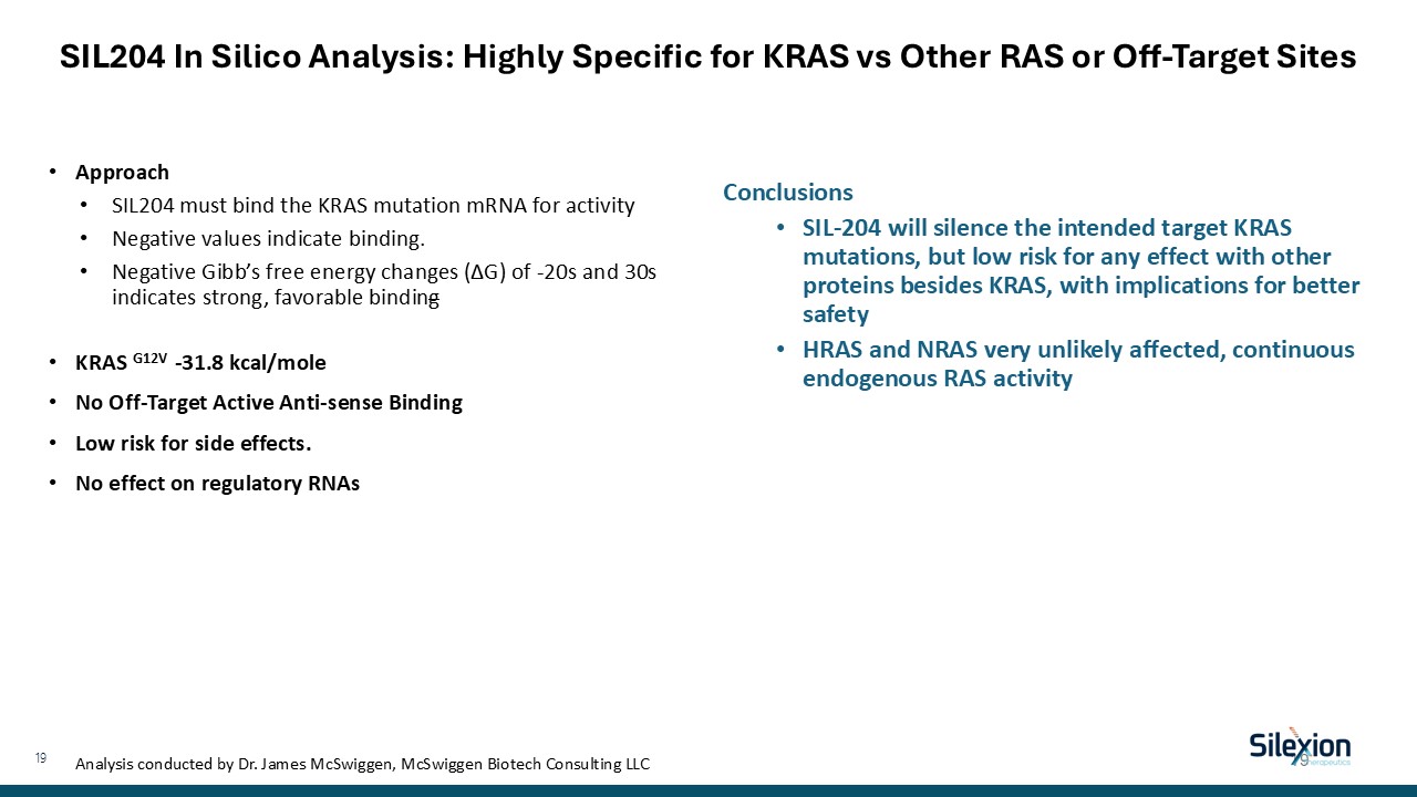 SIL204 In Silico Analysis: Highly Specific for KRAS vs Other RAS or Off-Target Sites  Approach  SIL204 must bind the KRAS mutation mRNA for activity  Negative values indicate binding.   Negative Gibb’s free energy changes (∆G) of -20s and 30s indicates strong, favorable binding  KRAS G12V -31.8 kcal/mole  No Off-Target Active Anti-sense Binding  Low risk for side effects.   No effect on regulatory RNAs  Conclusions  SIL-204 will silence the intended target KRAS mutations, but low risk for any effect with other proteins besides KRAS, with implications for better safety  HRAS and NRAS very unlikely affected, continuous endogenous RAS activity  Analysis conducted by Dr. James McSwiggen, McSwiggen Biotech Consulting LLC  19  19