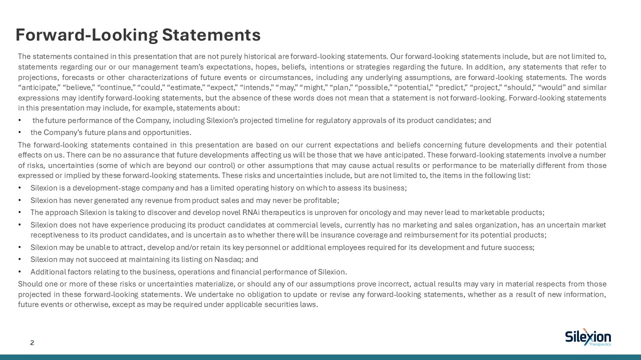 The statements contained in this presentation that are not purely historical are forward-looking statements. Our forward-looking statements include, but are not limited to, statements regarding our or our management team’s expectations, hopes, beliefs, intentions or strategies regarding the future. In addition, any statements that refer to projections, forecasts or other characterizations of future events or circumstances, including any underlying assumptions, are forward-looking statements. The words “anticipate,” “believe,” “continue,” “could,” “estimate,” “expect,” “intends,” “may,” “might,” “plan,” “possible,” “potential,” “predict,” “project,” “should,” “would” and similar expressions may identify forward-looking statements, but the absence of these words does not mean that a statement is not forward-looking. Forward-looking statements in this presentation may include, for example, statements about:   the future performance of the Company, including Silexion’s projected timeline for regulatory approvals of its product candidates; and  the Company’s future plans and opportunities.  The forward-looking statements contained in this presentation are based on our current expectations and beliefs concerning future developments and their potential effects on us. There can be no assurance that future developments affecting us will be those that we have anticipated. These forward-looking statements involve a number of risks, uncertainties (some of which are beyond our control) or other assumptions that may cause actual results or performance to be materially different from those expressed or implied by these forward-looking statements. These risks and uncertainties include, but are not limited to, the items in the following list:  Silexion is a development-stage company and has a limited operating history on which to assess its business;  Silexion has never generated any revenue from product sales and may never be profitable;  The approach Silexion is taking to discover and develop novel RNAi therapeutics is unproven for oncology and may never lead to marketable products;  Silexion does not have experience producing its product candidates at commercial levels, currently has no marketing and sales organization, has an uncertain market receptiveness to its product candidates, and is uncertain as to whether there will be insurance coverage and reimbursement for its potential products;  Silexion may be unable to attract, develop and/or retain its key personnel or additional employees required for its development and future success;  Silexion may not succeed at maintaining its listing on Nasdaq; and  Additional factors relating to the business, operations and financial performance of Silexion.  Should one or more of these risks or uncertainties materialize, or should any of our assumptions prove incorrect, actual results may vary in material respects from those projected in these forward-looking statements. We undertake no obligation to update or revise any forward-looking statements, whether as a result of new information, future events or otherwise, except as may be required under applicable securities laws.  2   Forward-Looking Statements