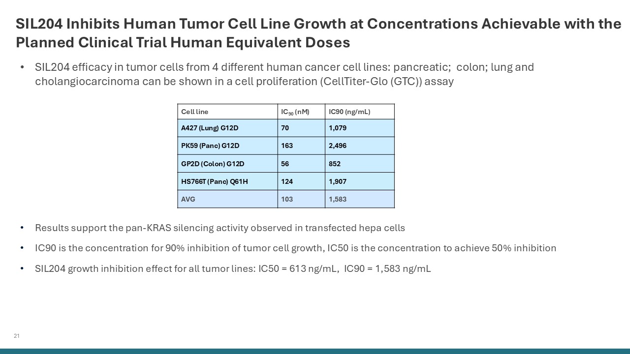 21   SIL204 Inhibits Human Tumor Cell Line Growth at Concentrations Achievable with the Planned Clinical Trial Human Equivalent Doses  Results support the pan-KRAS silencing activity observed in transfected hepa cells   IC90 is the concentration for 90% inhibition of tumor cell growth, IC50 is the concentration to achieve 50% inhibition  SIL204 growth inhibition effect for all tumor lines: IC50 = 613 ng/mL, IC90 = 1,583 ng/mL  Cell line  IC90 (nM)  IC90 (ng/mL)  A427 (Lung) G12D  70  1,079  PK59 (Panc) G12D  163  2,496  GP2D (Colon) G12D  56  852  HS766T (Panc) Q61H  124  1,907  AVG  103  1,583  SIL204 efficacy in tumor cells from 4 different human cancer cell lines: pancreatic; colon; lung and cholangiocarcinoma can be shown in a cell proliferation (CellTiter-Glo (GTC)) assay