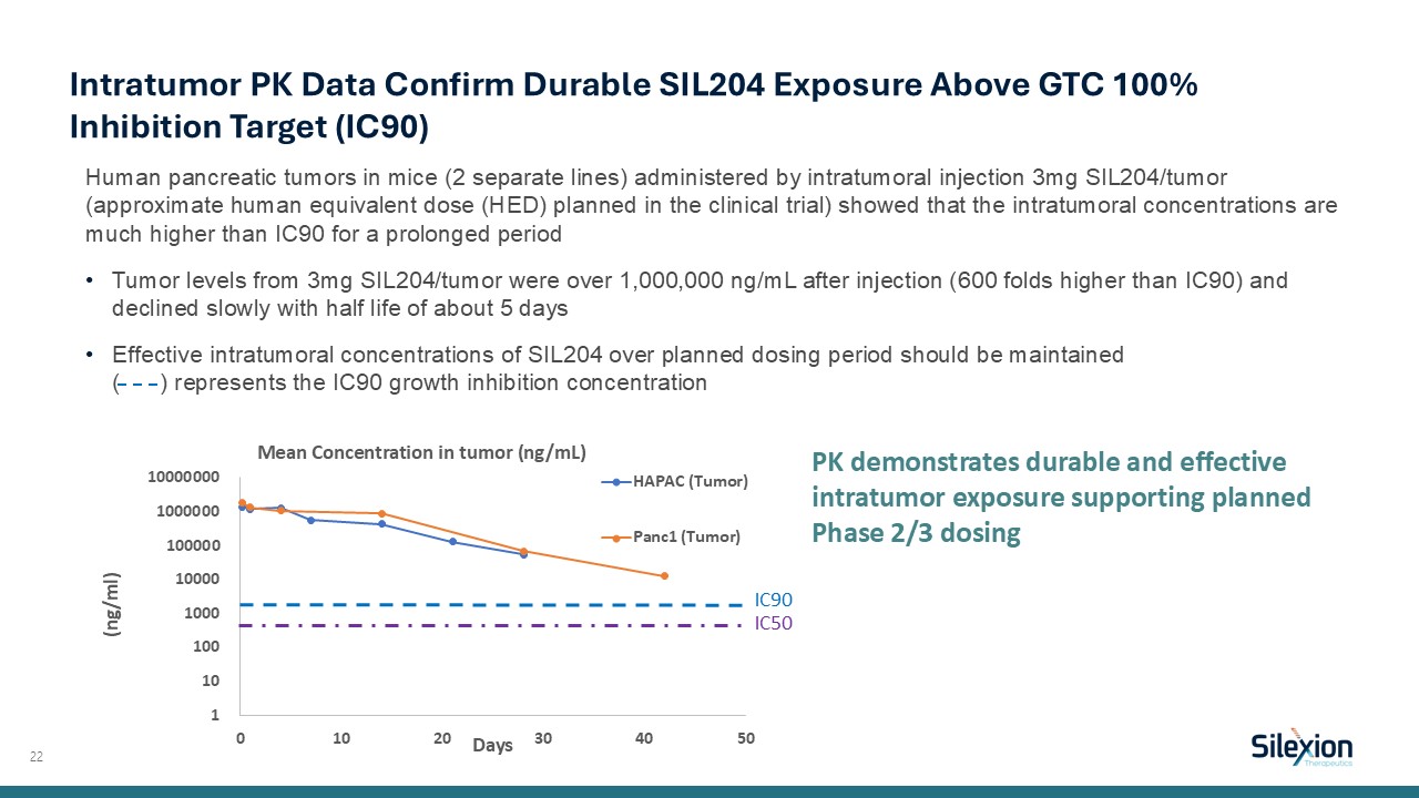 Human pancreatic tumors in mice (2 separate lines) administered by intratumoral injection 3mg SIL204/tumor (approximate human equivalent dose (HED) planned in the clinical trial) showed that the intratumoral concentrations are much higher than IC90 for a prolonged period  Tumor levels from 3mg SIL204/tumor were over 1,000,000 ng/mL after injection (600 folds higher than IC90) and declined slowly with half life of about 5 days  Effective intratumoral concentrations of SIL204 over planned dosing period should be maintained ( ) represents the IC90 growth inhibition concentration  22   Intratumor PK Data Confirm Durable SIL204 Exposure Above GTC 100% Inhibition Target (IC90)  PK demonstrates durable and effective intratumor exposure supporting planned   Phase 2/3 dosing  IC90  IC50
