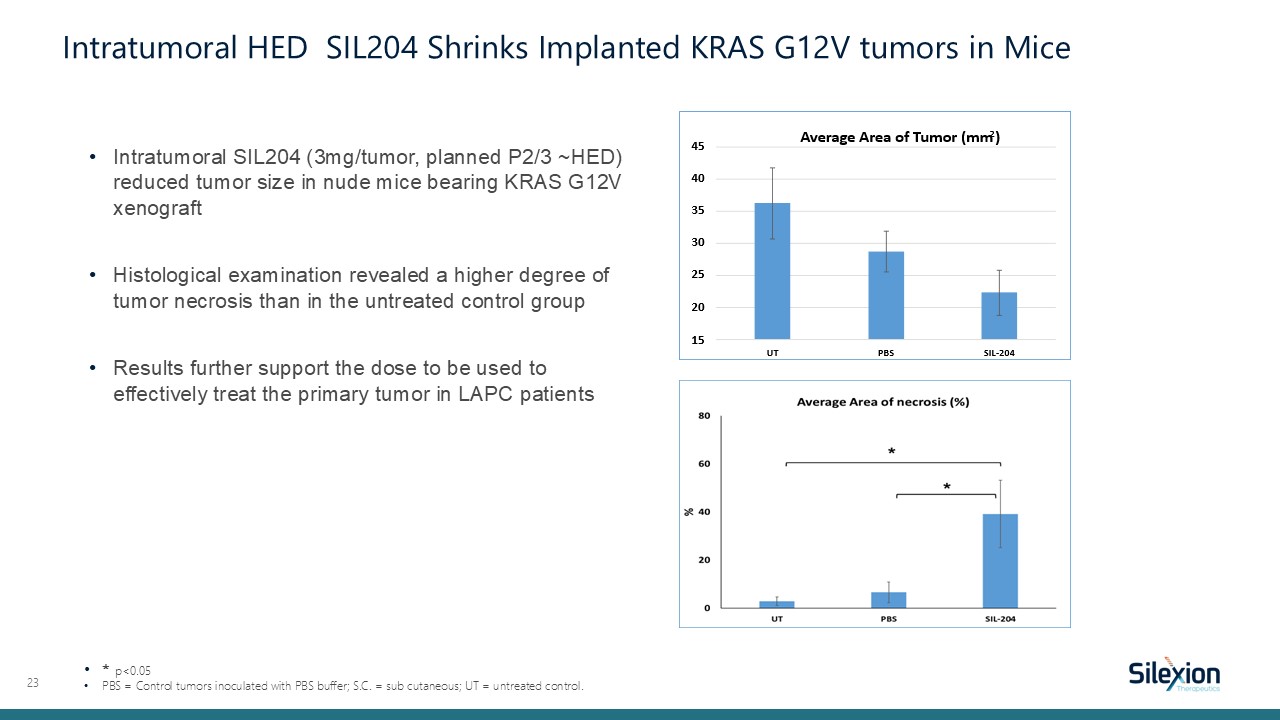Intratumoral SIL204 (3mg/tumor, planned P2/3 ~HED) reduced tumor size in nude mice bearing KRAS G12V xenograft  Histological examination revealed a higher degree of tumor necrosis than in the untreated control group  Results further support the dose to be used to effectively treat the primary tumor in LAPC patients  23  * p<0.05  PBS = Control tumors inoculated with PBS buffer; S.C. = sub cutaneous; UT = untreated control.  Intratumoral HED SIL204 Shrinks Implanted KRAS G12V tumors in Mice