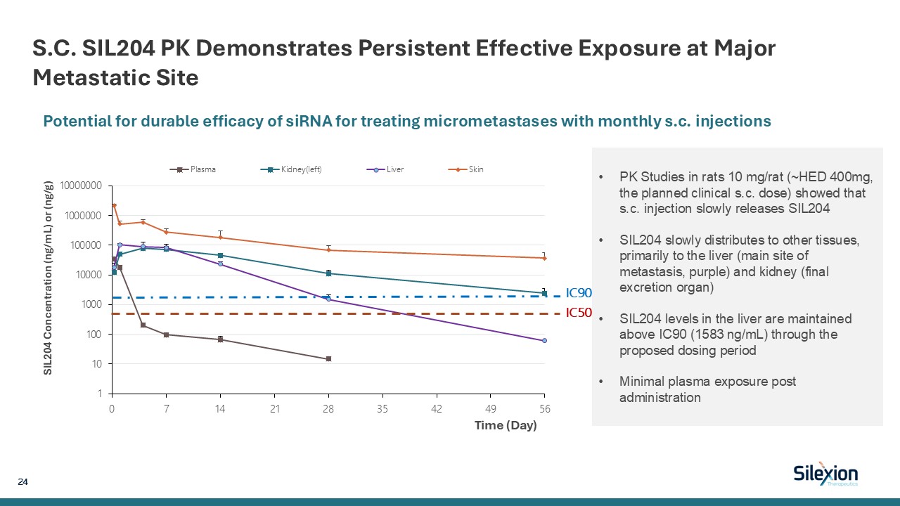 S.C. SIL204 PK Demonstrates Persistent Effective Exposure at Major Metastatic Site   24   PK Studies in rats 10 mg/rat (~HED 400mg, the planned clinical s.c. dose) showed that s.c. injection slowly releases SIL204   SIL204 slowly distributes to other tissues, primarily to the liver (main site of metastasis, purple) and kidney (final excretion organ)  SIL204 levels in the liver are maintained above IC90 (1583 ng/mL) through the proposed dosing period  Minimal plasma exposure post administration  Potential for durable efficacy of siRNA for treating micrometastases with monthly s.c. injections  IC90IC50