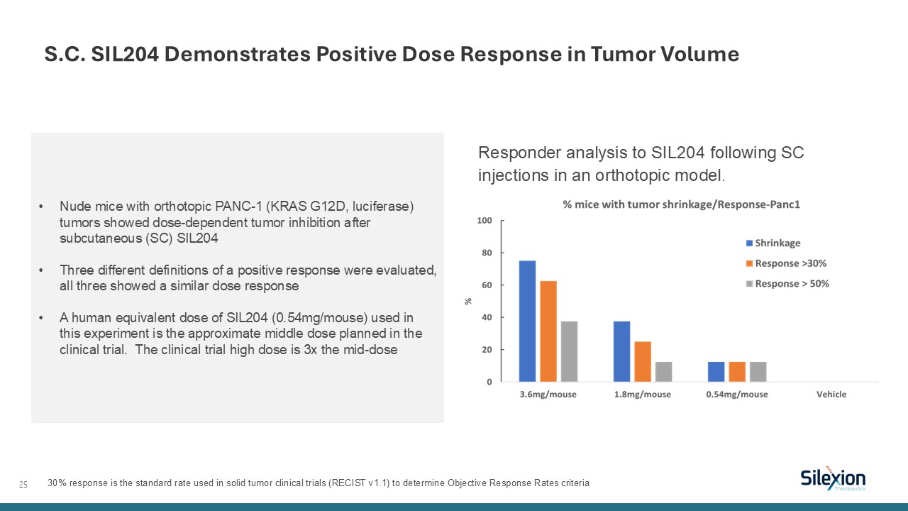 25  Responder analysis to SIL204 following SC injections in an orthotopic model.  S.C. SIL204 Demonstrates Positive Dose Response in Tumor Volume  Nude mice with orthotopic PANC-1 (KRAS G12D, luciferase) tumors showed dose-dependent tumor inhibition after subcutaneous (SC) SIL204  Three different definitions of a positive response were evaluated, all three showed a similar dose response  A human equivalent dose of SIL204 (0.54mg/mouse) used in this experiment is the approximate middle dose planned in the clinical trial. The clinical trial high dose is 3x the mid-dose   30% response is the standard rate used in solid tumor clinical trials (RECIST v1.1) to determine Objective Response Rates criteria