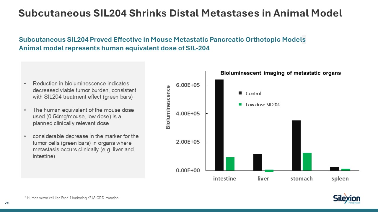 Subcutaneous SIL204 Shrinks Distal Metastases in Animal Model  26   Subcutaneous SIL204 Proved Effective in Mouse Metastatic Pancreatic Orthotopic Models Animal model represents human equivalent dose of SIL-204  * Human tumor cell line Panc-1 harboring KRAS G12D mutation  Control  Low dose SIL204  Reduction in bioluminescence indicates decreased viable tumor burden, consistent with SIL204 treatment effect (green bars)  The human equivalent of the mouse dose used (0.54mg/mouse, low dose) is a planned clinically relevant dose  considerable decrease in the marker for the tumor cells (green bars) in organs where metastasis occurs clinically (e.g. liver and intestine)
