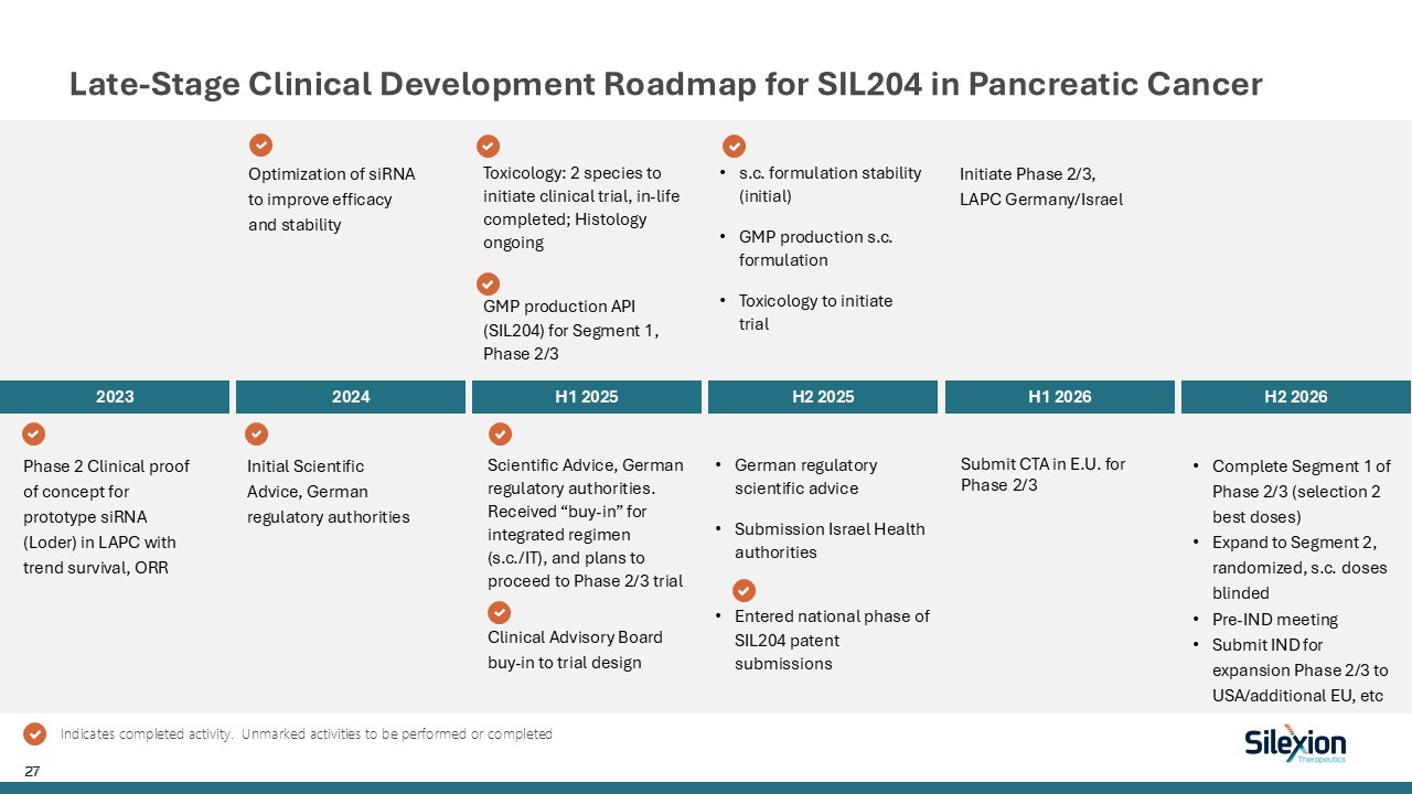 Late-Stage Clinical Development Roadmap for SIL204 in Pancreatic Cancer  2023  2024  H1 2025  H2 2025  H1 2026  H2 2026  Phase 2 Clinical proof of concept for prototype siRNA (Loder) in LAPC with trend survival, ORR  Optimization of siRNA to improve efficacy and stability  Initial Scientific Advice, German regulatory authorities  Toxicology: 2 species to initiate clinical trial, in-life completed; Histology ongoing  GMP production API (SIL204) for Segment 1, Phase 2/3  Initiate Phase 2/3, LAPC Germany/Israel  Complete Segment 1 of Phase 2/3 (selection 2 best doses)  Expand to Segment 2, randomized, s.c. doses blinded   Pre-IND meeting  Submit IND for expansion Phase 2/3 to USA/additional EU, etc   27   Indicates completed activity. Unmarked activities to be performed or completed  Scientific Advice, German regulatory authorities. Received “buy-in” for integrated regimen (s.c./IT), and plans to proceed to Phase 2/3 trial  s.c. formulation stability (initial)  GMP production s.c. formulation  Toxicology to initiate trial  German regulatory scientific advice  Submission Israel Health authorities  Entered national phase of SIL204 patent submissions  Clinical Advisory Board buy-in to trial design  Submit CTA in E.U. for Phase 2/3