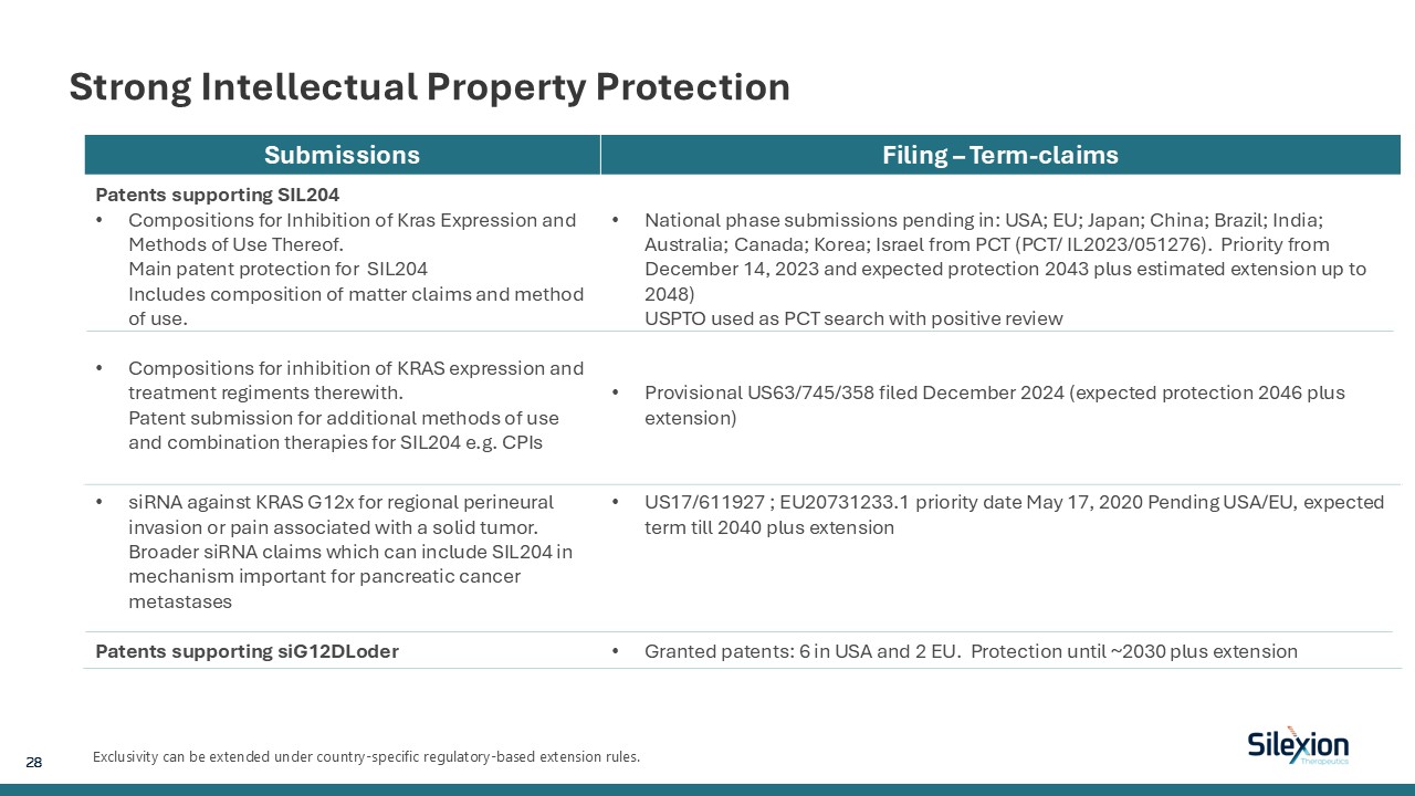 Strong Intellectual Property Protection  Exclusivity can be extended under country-specific regulatory-based extension rules.  Submissions  Filing – Term-claims  Patents supporting SIL204  Compositions for Inhibition of Kras Expression and Methods of Use Thereof.Main patent protection for SIL204Includes composition of matter claims and method of use.   Compositions for inhibition of KRAS expression and treatment regiments therewith.Patent submission for additional methods of use and combination therapies for SIL204 e.g. CPIs  National phase submissions pending in: USA; EU; Japan; China; Brazil; India; Australia; Canada; Korea; Israel from PCT (PCT/ IL2023/051276). Priority from December 14, 2023 and expected protection 2043 plus estimated extension up to 2048) USPTO used as PCT search with positive review  Provisional US63/745/358 filed December 2024 (expected protection 2046 plus extension)   siRNA against KRAS G12x for regional perineural invasion or pain associated with a solid tumor.Broader siRNA claims which can include SIL204 in mechanism important for pancreatic cancer metastases  Patents supporting siG12DLoder  US17/611927 ; EU20731233.1 priority date May 17, 2020 Pending USA/EU, expected term till 2040 plus extension  Granted patents: 6 in USA and 2 EU. Protection until ~2030 plus extension  28