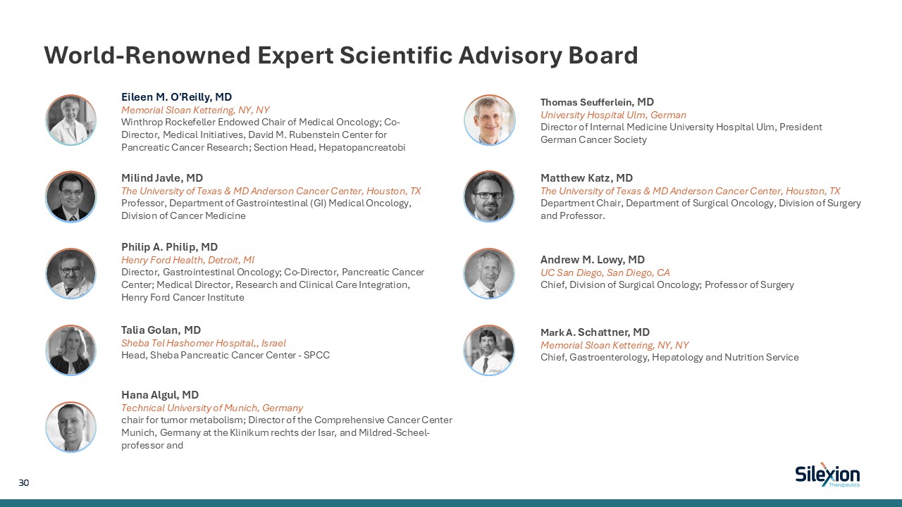 Silexion Positioned to Develop the Most Advanced Oncogene Silencing Therapy  Late-Stage Ready Asset with Regulatory Path Forward  Strong Partnerships with Solid IP Portfolio   Instead of targeting mutated KRAS proteins after they are formed (as competing technologies do) Silexion’s siRNA technology silences their expression at the outset, offering a potentially safer and more durable approach  KRAS-Focused RNA Interference Platform  First generation siG12DLoder siRNA Completed POC- Phase 2 clinical trial in LAPC   Demonstrated improvement in overall survival. Expected that siRNA silencing mechanism of the oncogene will overcome the tumoral resistance mechanism observed with KRAS inhibitors  Second generation, silencing siRNA “SIL204,” significantly improved product stability and delivery while providing a broader gene silencing activity. Preclinical results demonstrate SIL204’s pan-KRAS anti-tumor activity in pancreatic, colorectal and lung; supports dual-route strategy to administer SIL204 both intratumorally and s.c. to target primary tumor and metastases. Phase 2/3 clinical trial planned Q2, 2026; using integrated administration approach, s.c. plus intratumor  Promising Clinical Data in KRAS-Driven Locally Advanced Pancreatic Cancer   Compelling Preclinical Results for Second Generation Product  NASDAQ listed with experienced management team  Validated cancer target in mutated KRAS  Late-stage pan-KRAS silencing therapy. SIL204 API already manufactured by under GMP and ready for Phase 2/3 clinical trial  Late-Stage Company with a Stable Advanced siRNA Asset  29