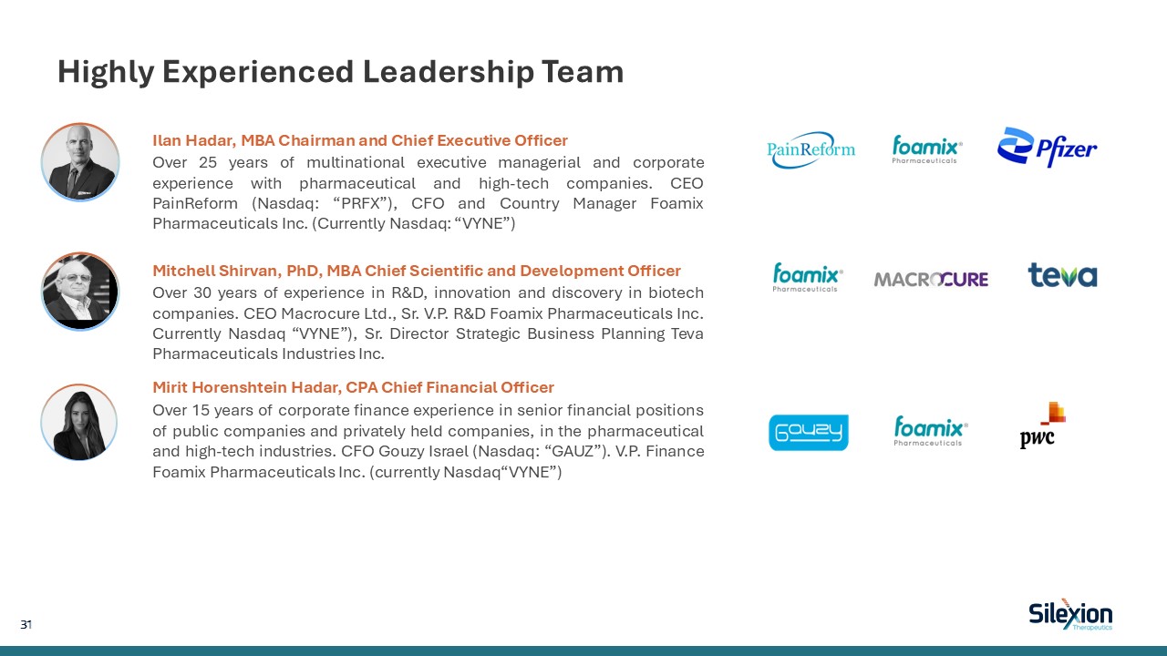 Highly Experienced Leadership Team  Ilan Hadar, MBA Chairman and Chief Executive Officer  Over 25 years of multinational executive managerial and corporate experience with pharmaceutical and high-tech companies. CEO PainReform (Nasdaq: “PRFX”), CFO and Country Manager Foamix Pharmaceuticals Inc. (Currently Nasdaq: “VYNE”)  Mitchell Shirvan, PhD, MBA Chief Scientific and Development Officer  Over 30 years of experience in R&D, innovation and discovery in biotech companies. CEO Macrocure Ltd., Sr. V.P. R&D Foamix Pharmaceuticals Inc. Currently Nasdaq “VYNE”), Sr. Director Strategic Business Planning Teva Pharmaceuticals Industries Inc.  Mirit Horenshtein Hadar, CPA Chief Financial Officer  Over 15 years of corporate finance experience in senior financial positions of public companies and privately held companies, in the pharmaceutical and high-tech industries. CFO Gouzy Israel (Nasdaq: “GAUZ”). V.P. Finance Foamix Pharmaceuticals Inc. (currently Nasdaq“VYNE”)  31
