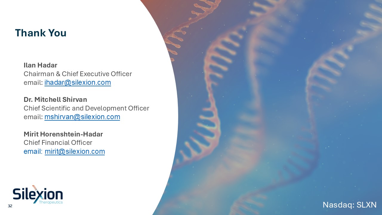 Thank You  Nasdaq: SLXN  Ilan Hadar   Chairman & Chief Executive Officer  email: ihadar@silexion.com  Dr. Mitchell Shirvan  Chief Scientific and Development Officer  email: mshirvan@silexion.com  Mirit Horenshtein-Hadar  Chief Financial Officer  email: mirit@silexion.com  32