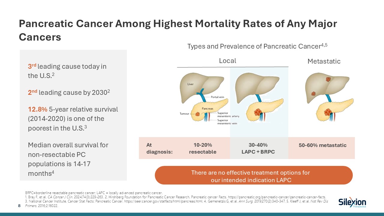 Pancreatic Cancer Among Highest Mortality Rates of Any Major Cancers  BRPC=borderline resectable pancreatic cancer; LAPC = locally advanced pancreatic cancer.   1. Bray F, et al. CA Cancer J Clin. 2024;74(3):229-263. 2. Hirshberg Foundation for Pancreatic Cancer Research. Pancreatic cancer Facts. https://pancreatic.org/pancreatic-cancer/pancreatic-cancer-facts. 3. National Cancer Institute. Cancer Stat Facts: Pancreatic Cancer. https://seer.cancer.gov/statfacts/html/pancreas.html. 4. Gemenetzis G, et al. Ann Surg. 2019;270(2):340-347. 5. Kleeff J, et al. Nat Rev Dis Primers. 2016;2:16022.   Local  Metastatic  At diagnosis:  10-20% resectable  30-40% LAPC + BRPC  50-60% metastatic   Types and Prevalence of Pancreatic Cancer4,5  8   There are no effective treatment options for our intended indication LAPC   3rd leading cause today in the U.S.2  2nd leading cause by 20302  12.8% 5-year relative survival (2014-2020) is one of the poorest in the U.S.3  Median overall survival for non-resectable PC populations is 14-17 months4