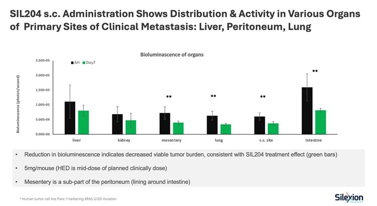 The study evaluated SIL204's biodistribution and therapeutic activity following subcutaneous administration in a metastatic pancreatic cancer mouse model using bioluminescent imaging. Results confirmed that SIL204 distributed to key organs where pancreatic cancer commonly spreads, with measurable reductions in tumor burden observed across multiple sites.