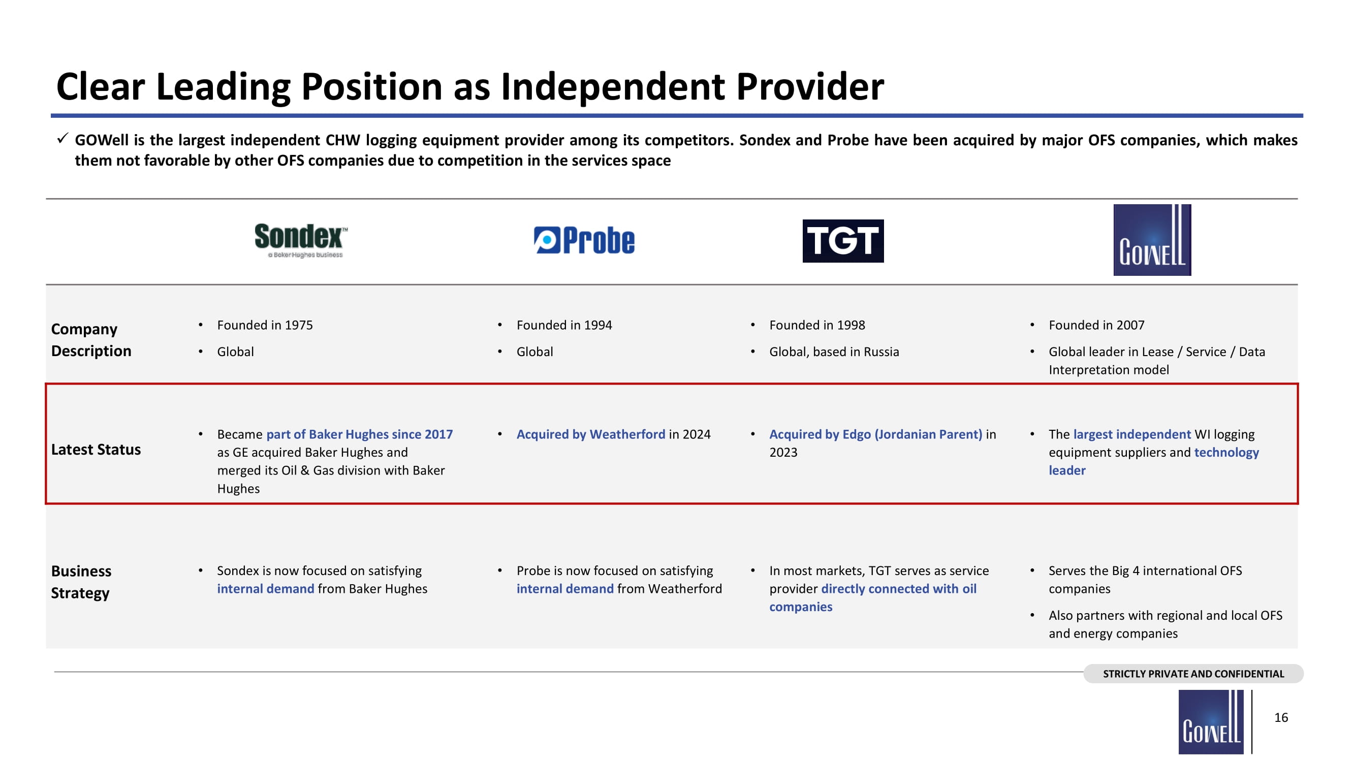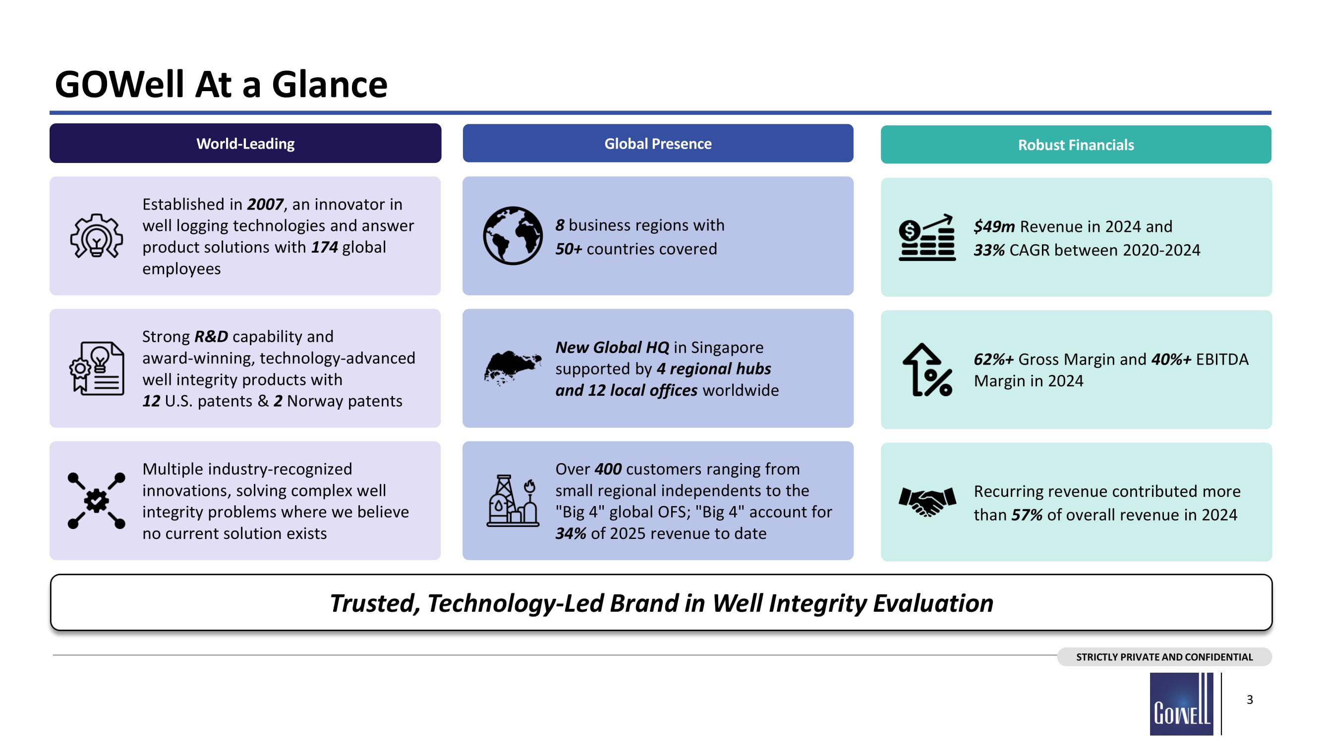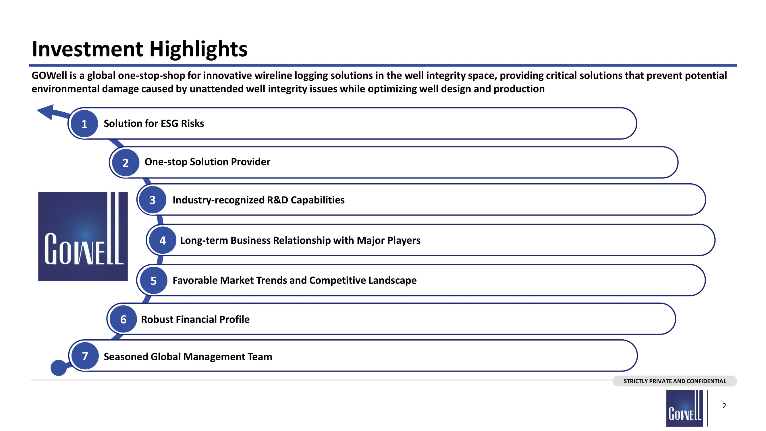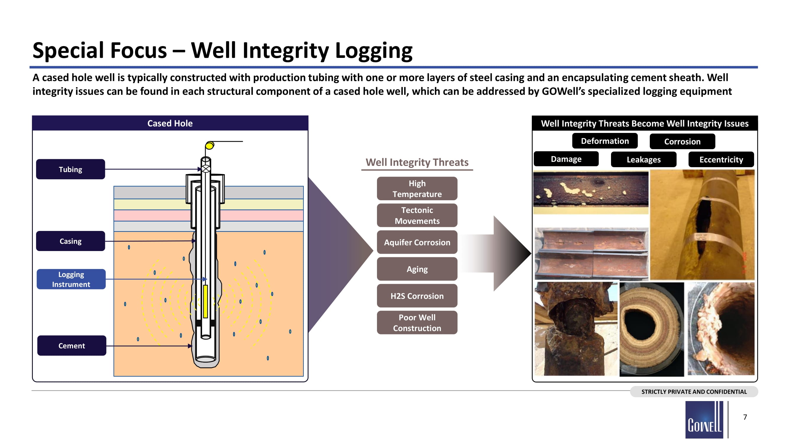 STRICTLY PRIVATE AND CONFIDENTIAL Investment Highlights 2 ✓ Wells constructed to harness geothermal energy, typically operated under high temperatures ✓ GOWell is providing solutions to geothermal projects at global basis including Indonesia, France, Germany, the U.S., East Africa, and Middle East GOWell is a global one - stop - shop for innovative wireline logging solutions in the well integrity space, providing critical solut ions that prevent potential environmental damage caused by unattended well integrity issues while optimizing well design and production Solution for ESG Risks 1 One - stop Solution Provider 2 Industry - recognized R&D Capabilities 3 4 Long - term Business Relationship with Major Players Favorable Market Trends and Competitive Landscape 5 Robust Financial Profile 6 Seasoned Global Management Team 7