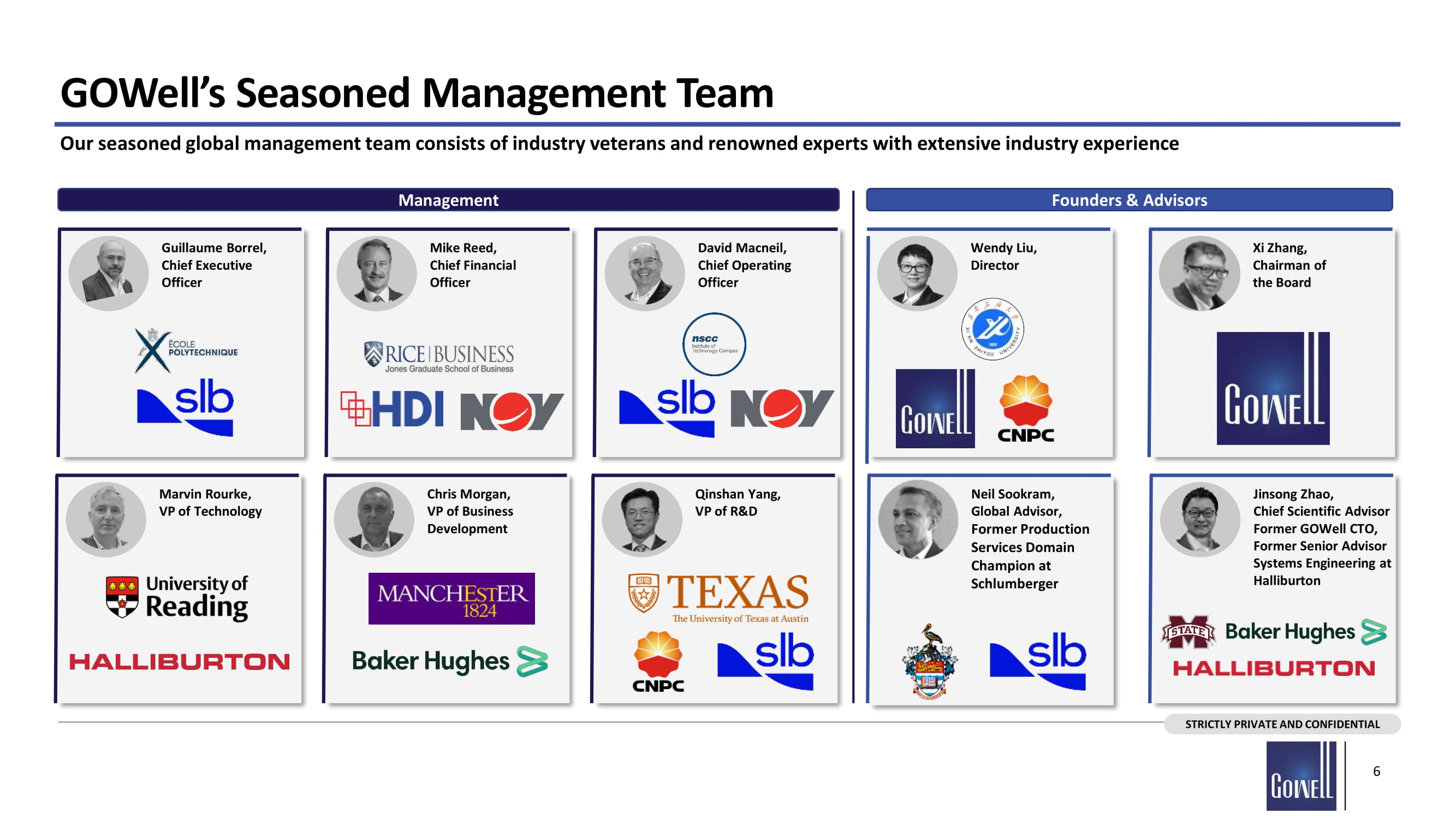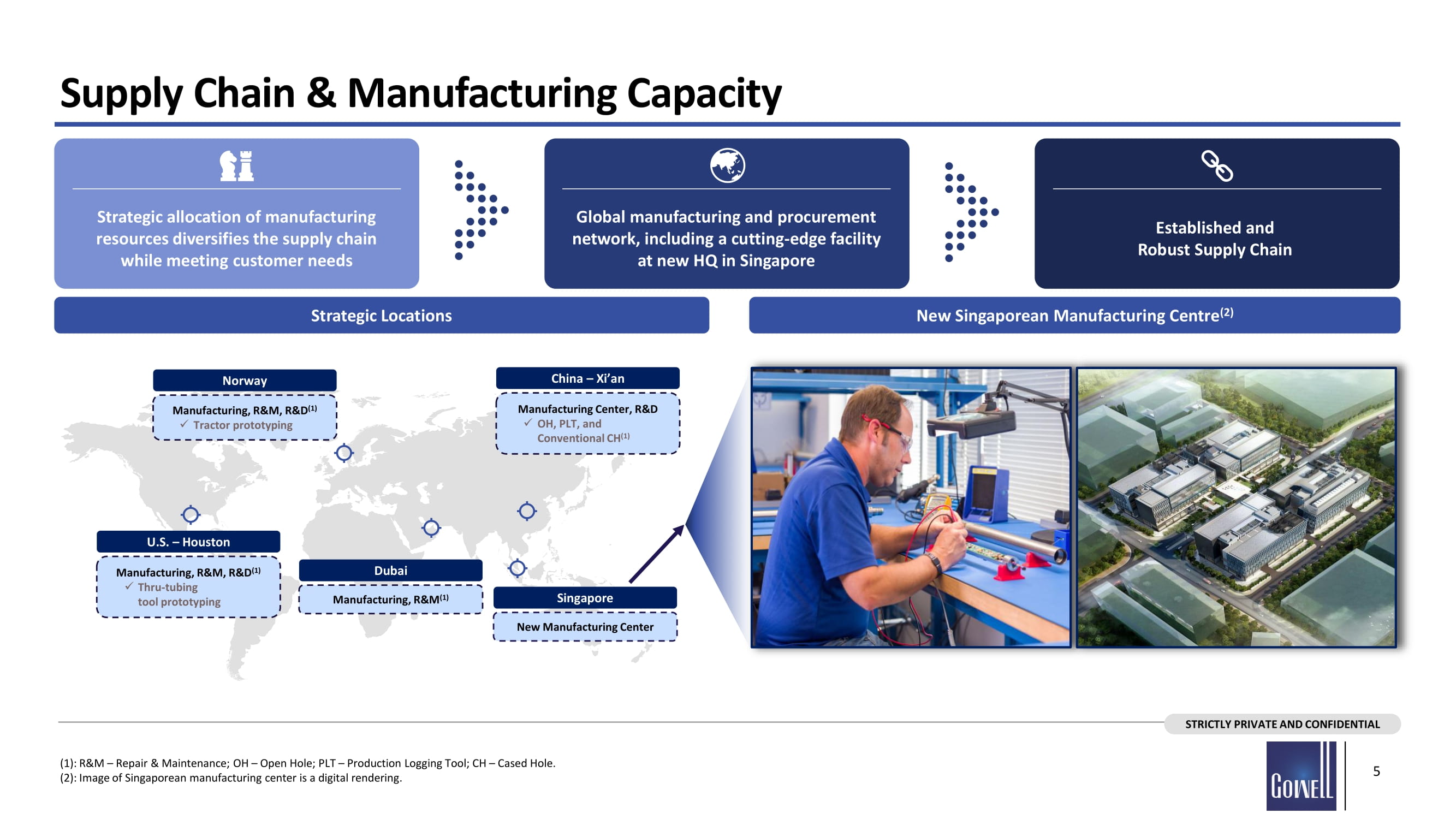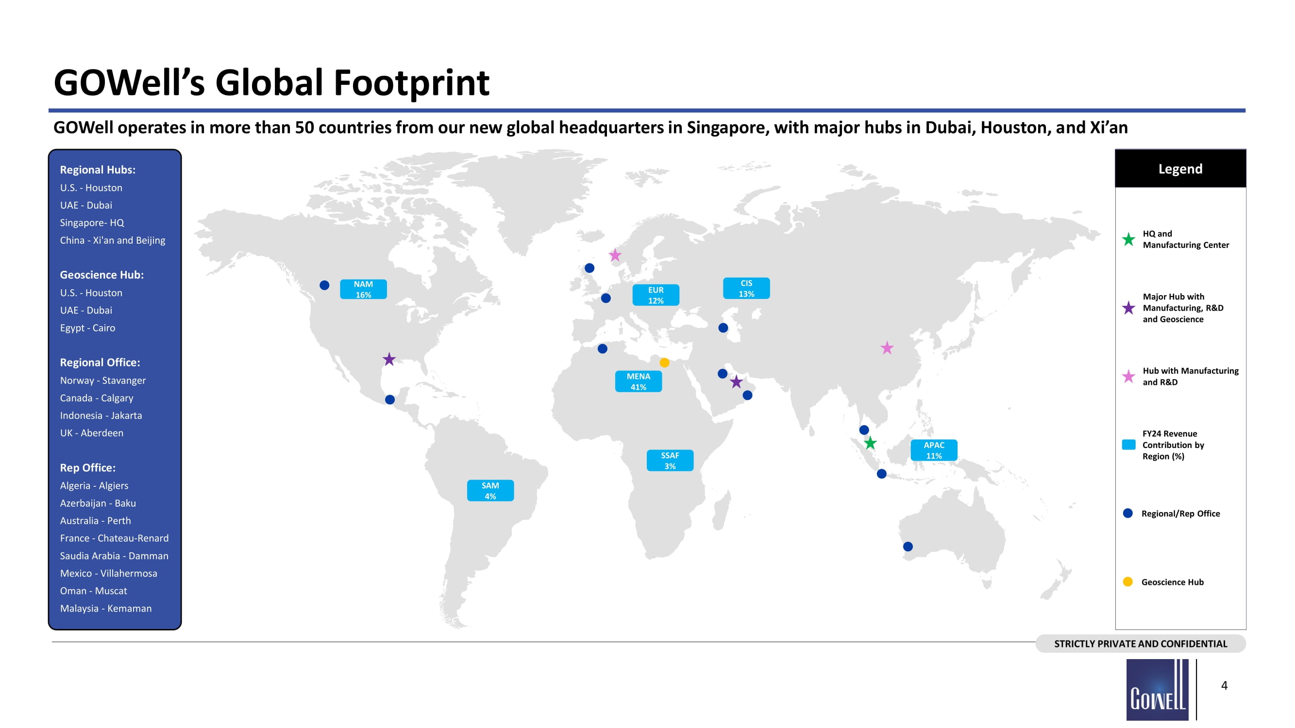 STRICTLY PRIVATE AND CONFIDENTIAL GOWell’s Global Footprint Legend NAM 16% SAM 4% MENA 41% EUR 12% CIS 13% SSAF 3% APAC 11% GOWell operates in more than 50 countries from our new global headquarters in Singapore, with major hubs in Dubai, Houston, a nd Xi’an Regional Hubs: U.S. - Houston UAE - Dubai Singapore - HQ China - Xi'an and Beijing Geoscience Hub: U.S. - Houston UAE - Dubai Egypt - Cairo Regional Office: Norway - Stavanger Canada - Calgary Indonesia - Jakarta UK - Aberdeen Rep Office: Algeria - Algiers Azerbaijan - Baku Australia - Perth France - Chateau - Renard Saudia Arabia - Damman Mexico - Villahermosa Oman - Muscat Malaysia - Kemaman Major Hub with Manufacturing, R&D and Geoscience Hub with Manufacturing and R&D Regional/Rep Office HQ and Manufacturing Center FY24 Revenue Contribution by Region (%) Geoscience Hub 4
