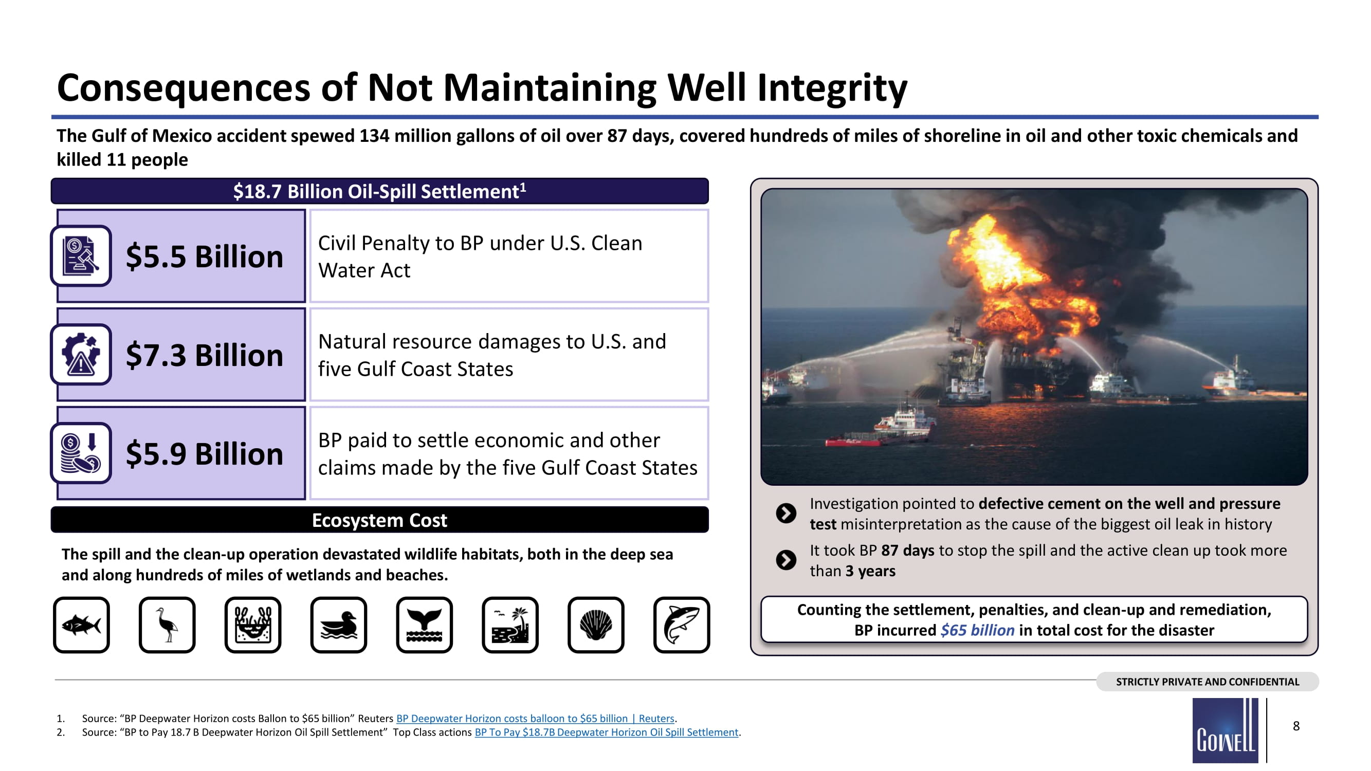 STRICTLY PRIVATE AND CONFIDENTIAL Consequences of Not Maintaining Well Integrity 1. Source: “BP Deepwater Horizon costs Ballon to $65 billion” Reuters BP Deepwater Horizon costs balloon to $65 billion | Reuters . 2. Source: “BP to Pay 18.7 B Deepwater Horizon Oil Spill Settlement” Top Class actions BP To Pay $18.7B Deepwater Horizon Oil Spill Settlement . 8 $18.7 Billion Oil - Spill Settlement 1 Civil Penalty to BP under U.S. Clean Water Act Natural resource damages to U.S. and five Gulf Coast States BP paid to settle economic and other claims made by the five Gulf Coast States Ecosystem Cost The spill and the clean - up operation devastated wildlife habitats, both in the deep sea and along hundreds of miles of wetlands and beaches. The Gulf of Mexico accident spewed 134 million gallons of oil over 87 days, covered hundreds of miles of shoreline in oil and ot her toxic chemicals and killed 11 people $5.5 Billion $7.3 Billion $5.9 Billion Investigation pointed to defective cement on the well and pressure test misinterpretation as the cause of the biggest oil leak in history It took BP 87 days to stop the spill and the active clean up took more than 3 years Counting the settlement, penalties, and clean - up and remediation, BP incurred $65 billion in total cost for the disaster