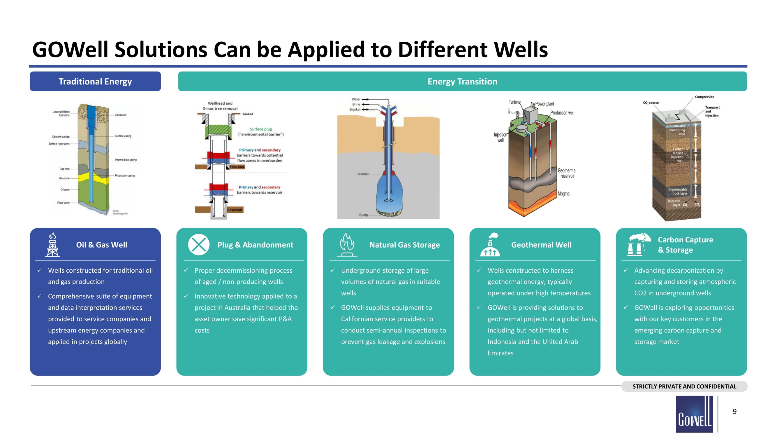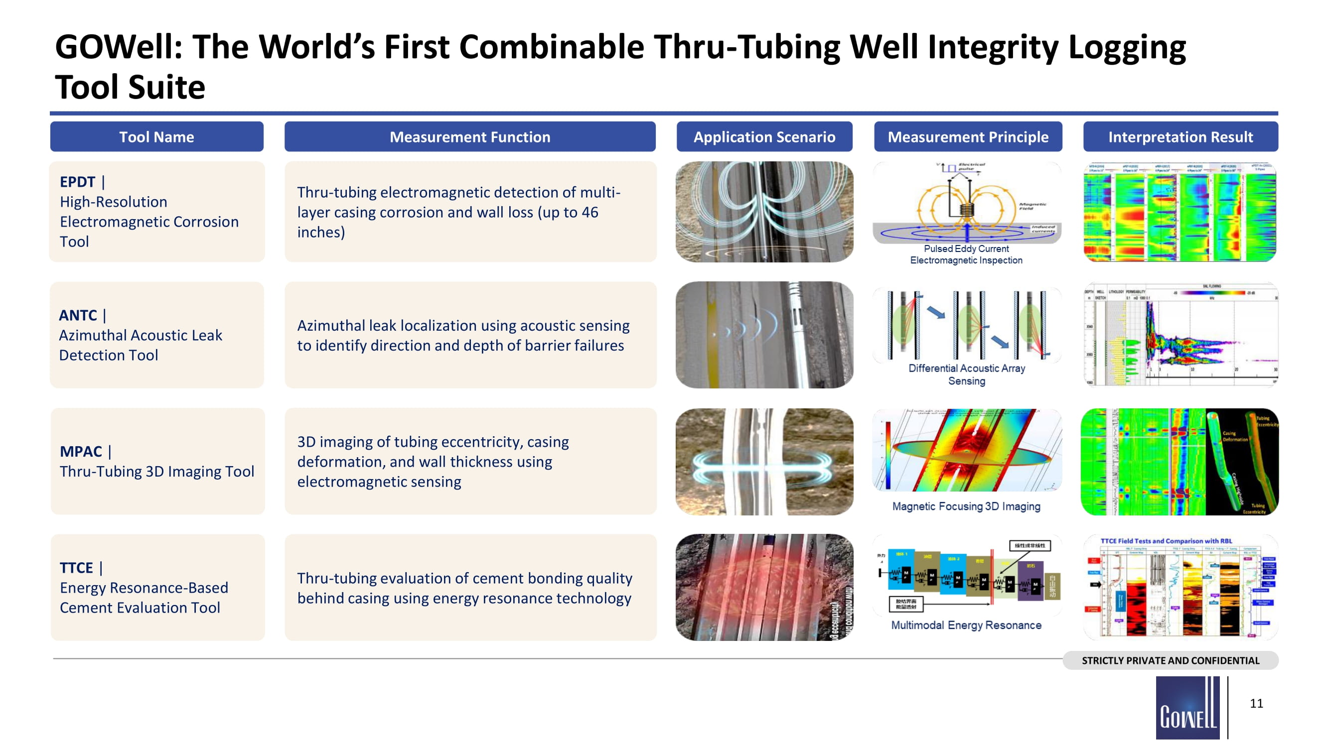 STRICTLY PRIVATE AND CONFIDENTIAL Major GOWell Family Products 10 ✓ Proper decommission process of an aged / non - producing wells ✓ Innovative technology applied to a project in Australia that helped the asset owner save an estimated $30 million in P&A costs Well Integrity Plug & Abandonment ✓ Advanced Resonance based cement evaluation thru - tubing Cement Evaluation ✓ Conveyance allows access to the most geometrically complex wells, including Horizontals Tractor Conveyance ✓ Underground storage of large volumes of natural gas in suitable wells Data Analytics ✓ In - house developed Interpretation software performing diagnostics Software Geoscience Reservoirs ✓ Precision Instruments for evaluating reservoirs globally Formation Evaluation ✓ Formation Imaging and Anisotropic Acoustics Advanced Evaluation Technologies Oil & Gas Well ✓ Evaluation of 5 multi - pipe casing strings deployed thru - tubing Multi - Pipe Integrity ✓ Advanced High - Fidelity Array Spectral Noise Leak Detection Production Profiling ✓ Cutting - edge distributed fiber optic sensing to analyze well dynamics ✓ Production and Injection profiling with advanced flow profiling technologies Production Surveillance Distributed Fiber Optics Cased Hole Open Hole