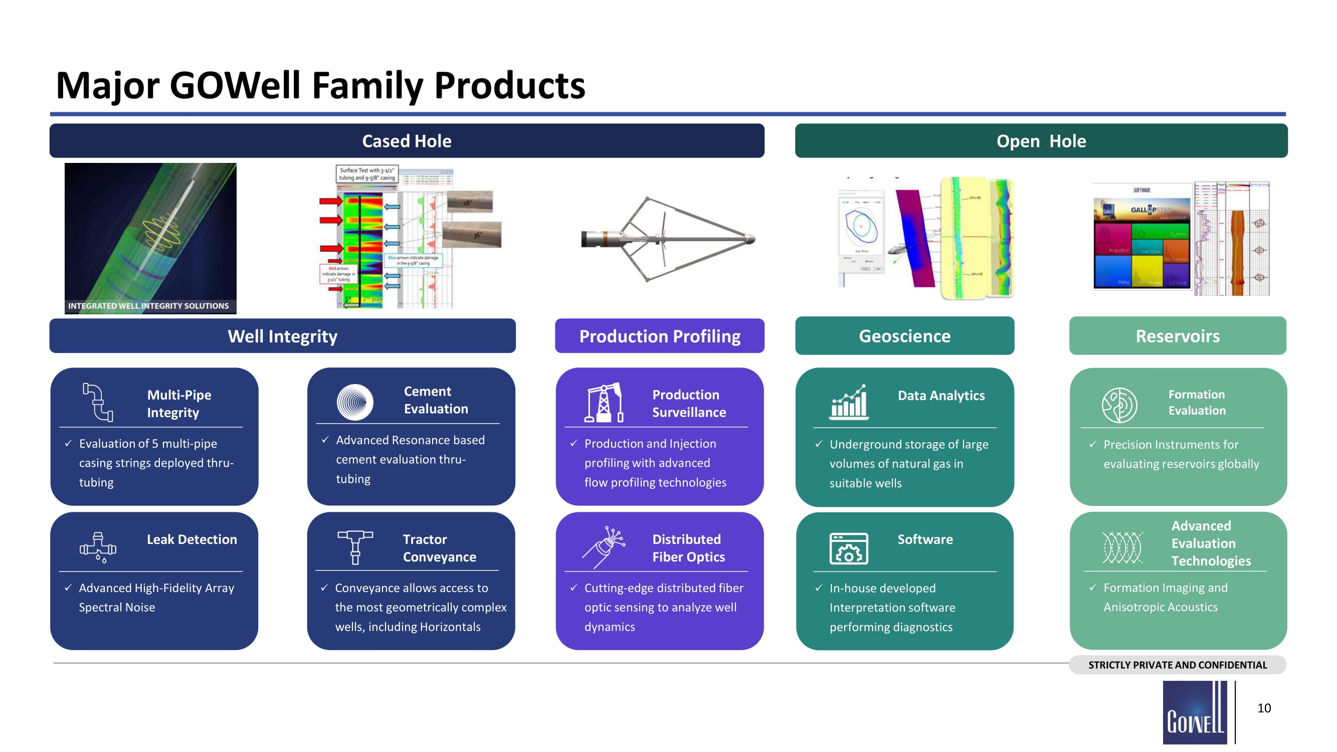 STRICTLY PRIVATE AND CONFIDENTIAL GOWell Solutions Can be Applied to Different Wells 9 Traditional Energy Energy Transition ✓ Proper decommissioning process of aged / non - producing wells ✓ Innovative technology applied to a project in Australia that helped the asset owner save significant P&A costs Plug & Abandonment ✓ Underground storage of large volumes of natural gas in suitable wells ✓ GOWell supplies equipment to Californian service providers to conduct semi - annual inspections to prevent gas leakage and explosions Natural Gas Storage ✓ Wells constructed to harness geothermal energy, typically operated under high temperatures ✓ GOWell is providing solutions to geothermal projects at a global basis, including but not limited to Indonesia and the United Arab Emirates Geothermal Well ✓ Advancing decarbonization by capturing and storing atmospheric CO2 in underground wells ✓ GOWell is exploring opportunities with our key customers in the emerging carbon capture and storage market Carbon Capture & Storage ✓ Wells constructed for traditional oil and gas production ✓ Comprehensive suite of equipment and data interpretation services provided to service companies and upstream energy companies and applied in projects globally Oil & Gas Well