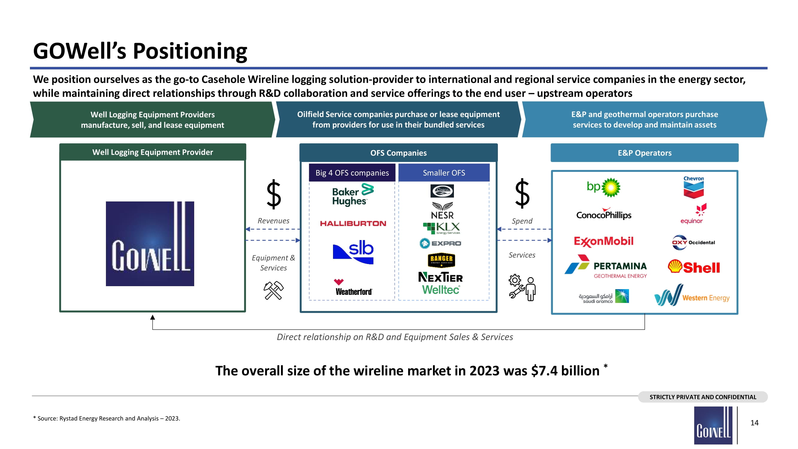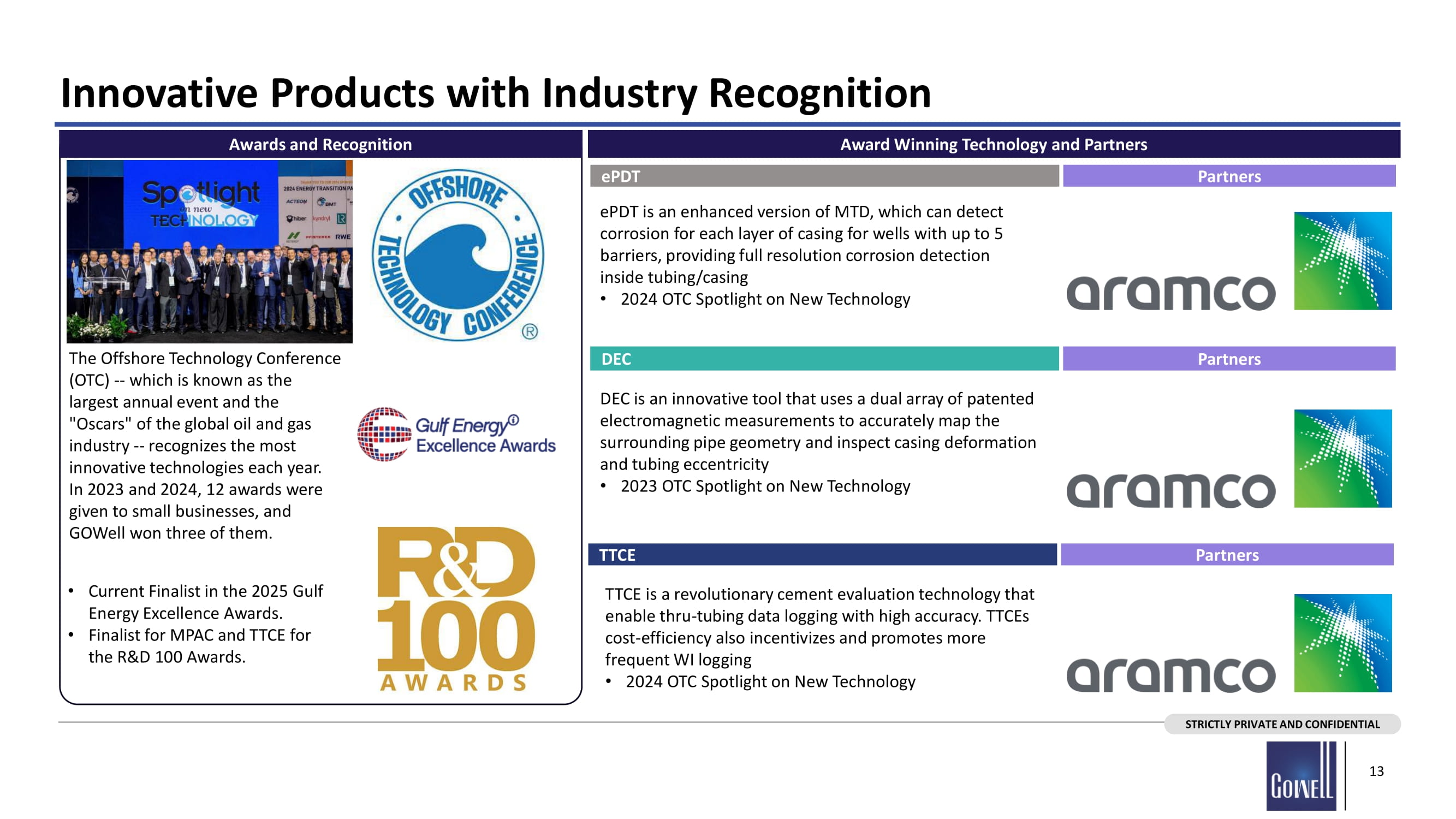 STRICTLY PRIVATE AND CONFIDENTIAL Innovative Products with Industry Recognition The Offshore Technology Conference (OTC) -- which is known as the largest annual event and the "Oscars" of the global oil and gas industry -- recognizes the most innovative technologies each year. In 2023 and 2024, 12 awards were given to small businesses, and GOWell won three of them. Awards and Recognition • Current Finalist in the 2025 Gulf Energy Excellence Awards. • Finalist for MPAC and TTCE for the R&D 100 Awards. Award Winning Technology and Partners ePDT is an enhanced version of MTD, which can detect corrosion for each layer of casing for wells with up to 5 barriers, providing full resolution corrosion detection inside tubing/casing • 2024 OTC Spotlight on New Technology ePDT Partners DEC is an innovative tool that uses a dual array of patented electromagnetic measurements to accurately map the surrounding pipe geometry and inspect casing deformation and tubing eccentricity • 2023 OTC Spotlight on New Technology DEC Partners TTCE is a revolutionary cement evaluation technology that enable thru - tubing data logging with high accuracy. TTCEs cost - efficiency also incentivizes and promotes more frequent WI logging • 2024 OTC Spotlight on New Technology TTCE Partners 13
