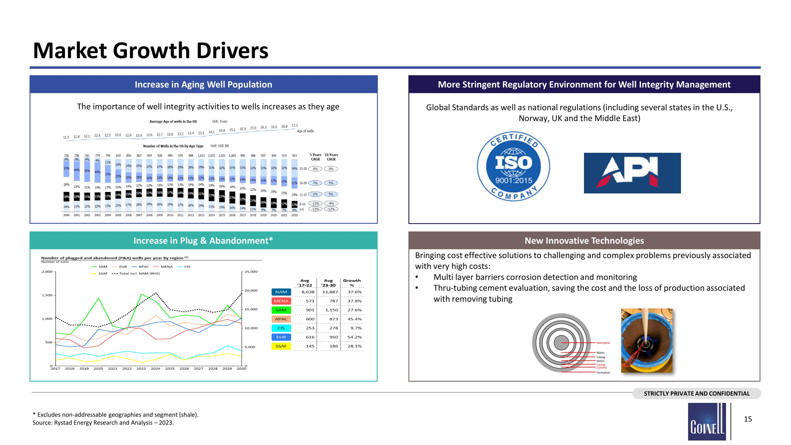 STRICTLY PRIVATE AND CONFIDENTIAL GOWell’s Positioning 14 * Source: Rystad Energy Research and Analysis – 2023. Well Logging Equipment Provider E&P and geothermal operators purchase services to develop and maintain assets Oilfield Service companies purchase or lease equipment from providers for use in their bundled services Well Logging Equipment Providers manufacture, sell, and lease equipment Spend Services Revenues Equipment & Services Direct relationship on R&D and Equipment Sales & Services OFS Companies E&P Operators Big 4 OFS companies Smaller OFS We position ourselves as the go - to Casehole Wireline logging solution - provider to international and regional service companies i n the energy sector, while maintaining direct relationships through R&D collaboration and service offerings to the end user – upstream operators The overall size of the wireline market in 2023 was $7.4 billion *