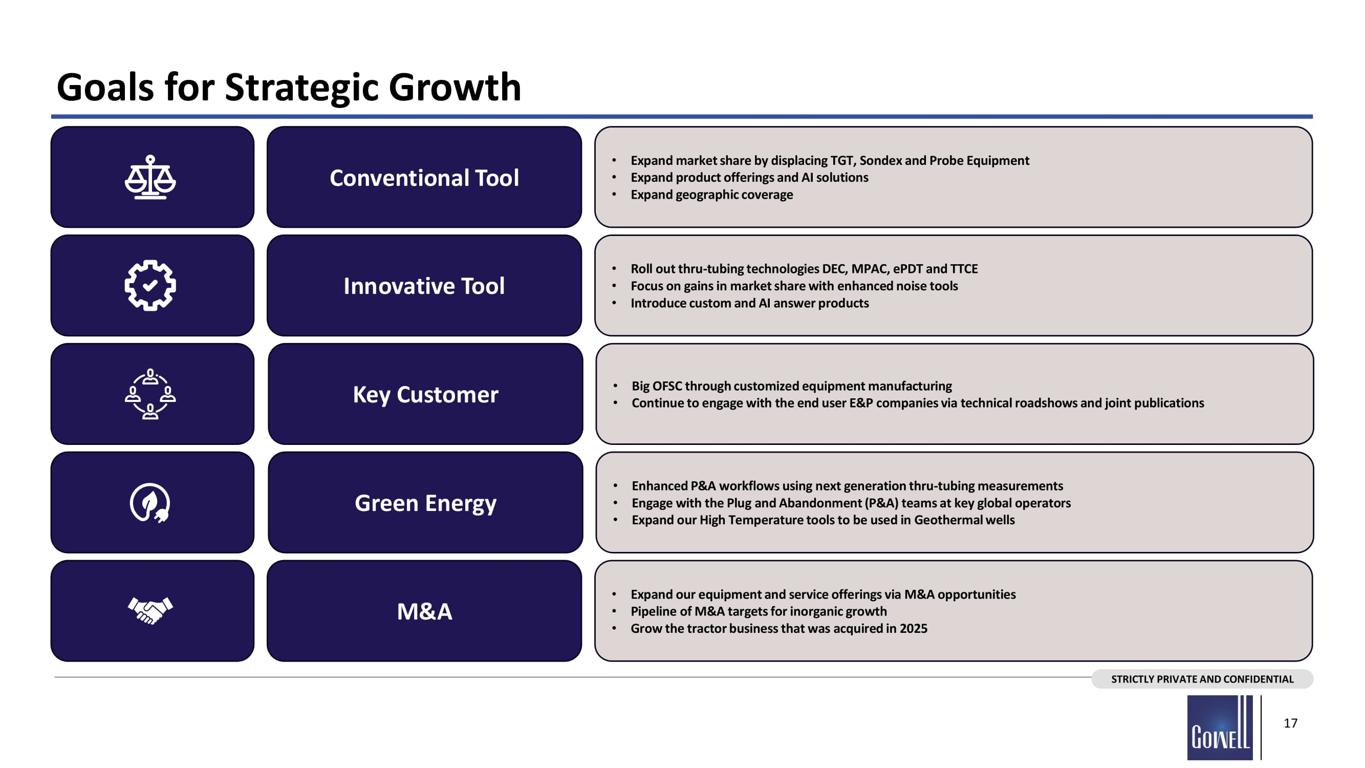 STRICTLY PRIVATE AND CONFIDENTIAL Goals for Strategic Growth Conventional Tool • Expand market share by displacing TGT, Sondex and Probe Equipment • Expand product offerings and AI solutions • Expand geographic coverage Innovative Tool • Roll out thru - tubing technologies DEC, MPAC, ePDT and TTCE • Focus on gains in market share with enhanced noise tools • Introduce custom and AI answer products Key Customer • Big OFSC through customized equipment manufacturing • Continue to engage with the end user E&P companies via technical roadshows and joint publications Green Energy • Enhanced P&A workflows using next generation thru - tubing measurements • Engage with the Plug and Abandonment (P&A) teams at key global operators • Expand our High Temperature tools to be used in Geothermal wells M&A • Expand our equipment and service offerings via M&A opportunities • Pipeline of M&A targets for inorganic growth • Grow the tractor business that was acquired in 2025 17