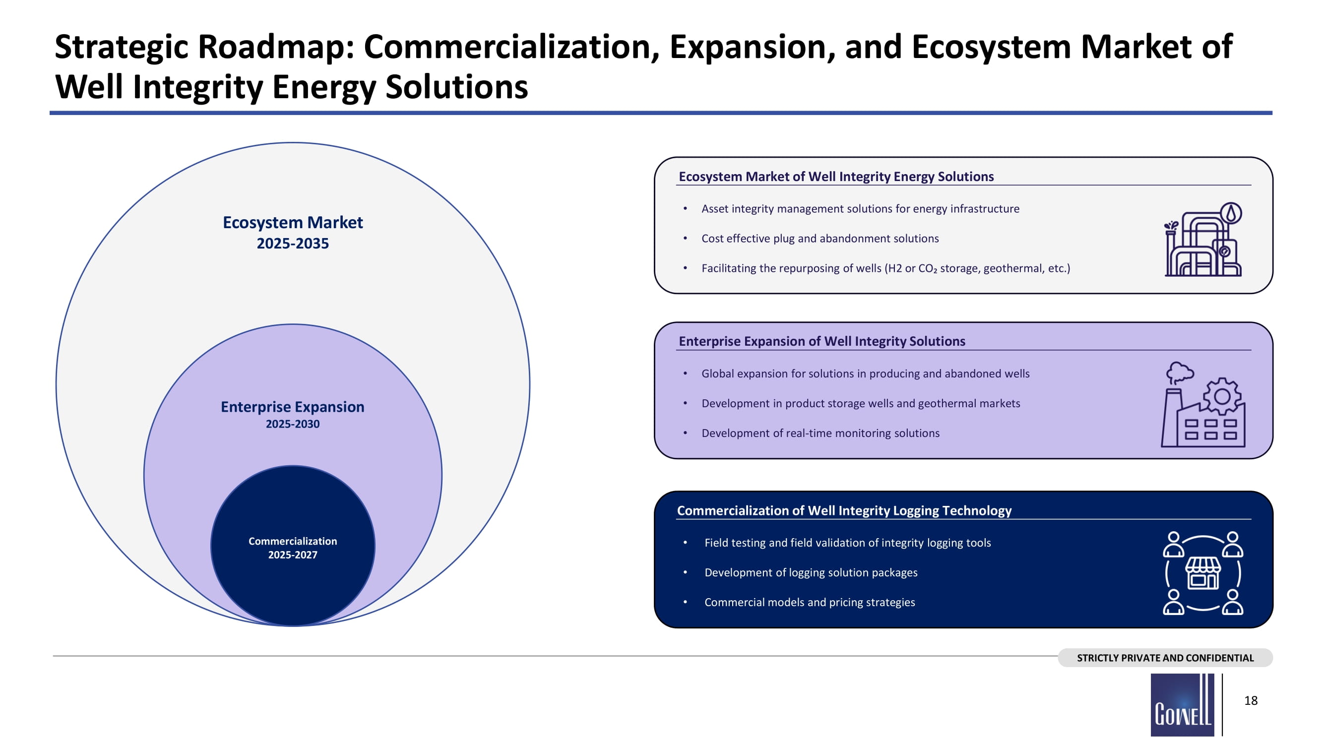 STRICTLY PRIVATE AND CONFIDENTIAL Strategic Roadmap: Commercialization, Expansion, and Ecosystem Market of Well Integrity Energy Solutions 18 Commercialization 2025 - 2027 Enterprise Expansion 2025 - 2030 Ecosystem Market 2025 - 2035 Commercialization of Well Integrity Logging Technology Ecosystem Market of Well Integrity Energy Solutions Enterprise Expansion of Well Integrity Solutions • Asset integrity management solutions for energy infrastructure • Cost effective plug and abandonment solutions • Facilitating the repurposing of wells (H2 or CO₂ storage, geothermal, etc.) • Global expansion for solutions in producing and abandoned wells • Development in product storage wells and geothermal markets • Development of real - time monitoring solutions • Field testing and field validation of integrity logging tools • Development of logging solution packages • Commercial models and pricing strategies