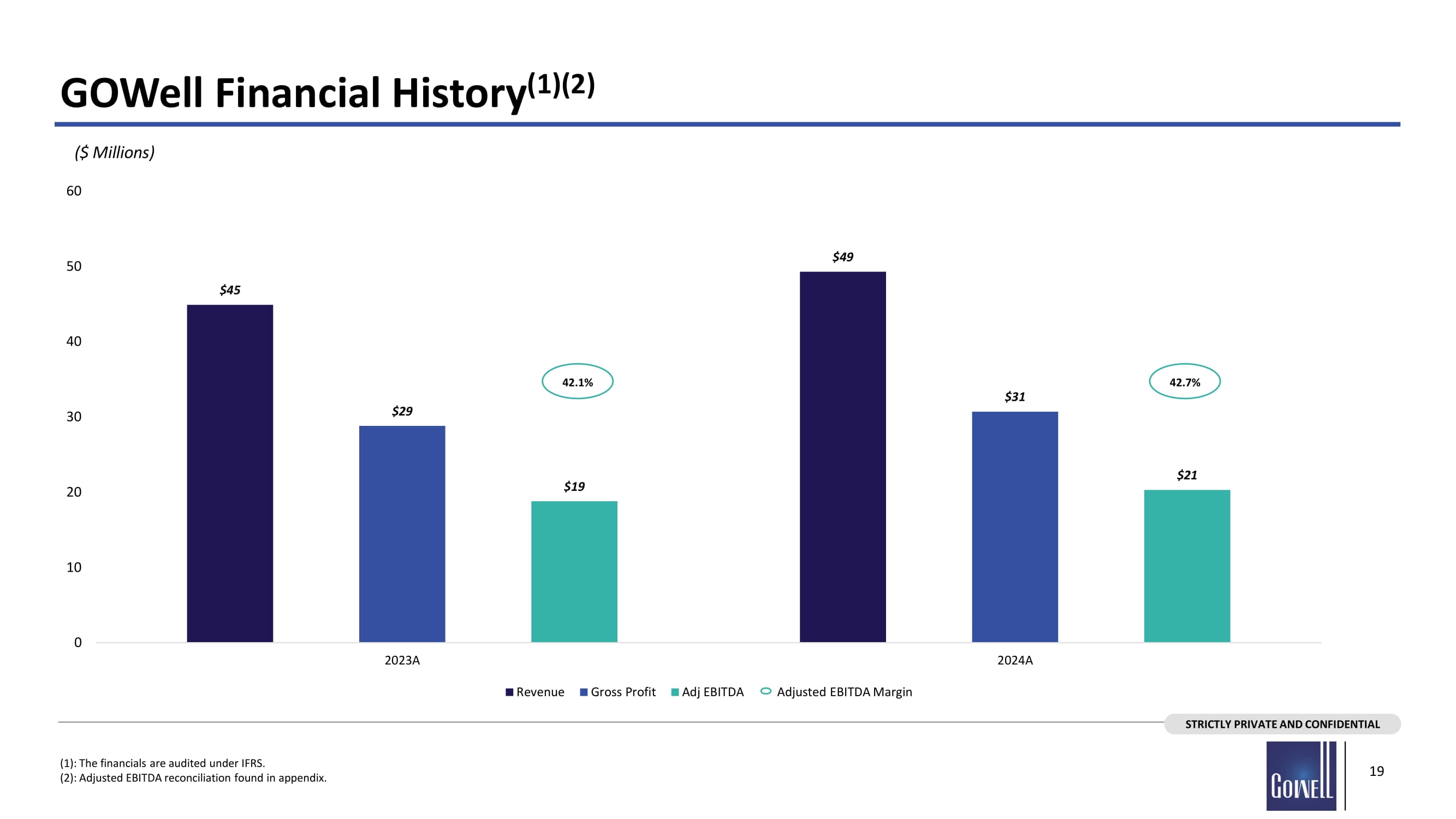 STRICTLY PRIVATE AND CONFIDENTIAL Adj EBITDA Margin $45 $49 $29 $31 $19 $21 0 10 20 30 40 50 60 2023A 2024A Revenue Gross Profit Adj EBITDA GOWell Financial History (1)(2) ($ Millions) 19 42.1% 42.7% Adjusted EBITDA Margin (1): The financials are audited under IFRS. (2): Adjusted EBITDA reconciliation found in appendix.