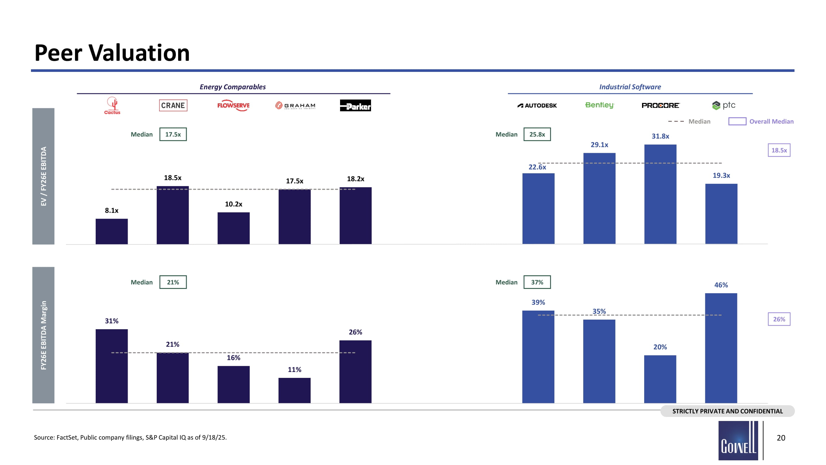 STRICTLY PRIVATE AND CONFIDENTIAL 31% 21% 16% 11% 26% 39% 35% 20% 46% Peer Valuation 20 8.1x 18.5x 10.2x 17.5x 18.2x 22.6x 29.1x 31.8x 19.3x EV / FY26E EBITDA FY26E EBITDA Margin 18.5x 26% 17.5x 25.8x 21% 37% Median Median Median Median Median Overall Median Energy Comparables Industrial Software Source: FactSet, Public company filings, S&P Capital IQ as of 9/18/25.