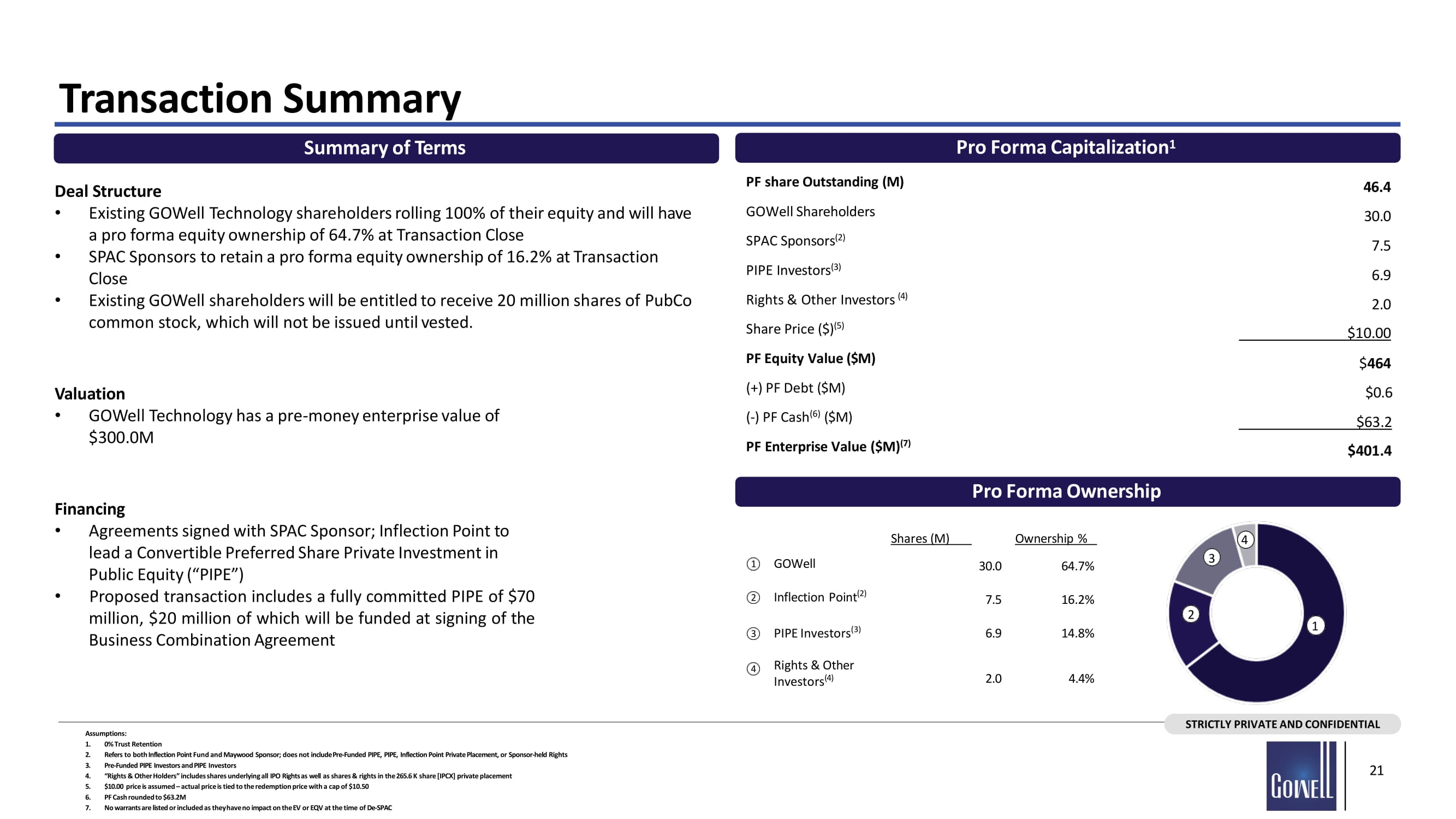 STRICTLY PRIVATE AND CONFIDENTIAL TransactionSummary SummaryofTerms DealStructure • ExistingGOWell Technologyshareholdersrolling100%oftheirequityandwillhave aproformaequityownershipof64.7%atTransactionClose • SPACSponsors toretainaproformaequityownershipof16.2%at Transaction Close • ExistingGOWell shareholderswillbeentitledtoreceive20millionsharesof PubCo common stock, whichwill notbeissueduntilvested. Valuation • GOWellTechnologyhasapre - moneyenterprisevalueof $300.0M Financing • AgreementssignedwithSPACSponsor;InflectionPointto leadaConvertiblePreferredSharePrivateInvestmentin PublicEquity ( “ P I P E ” ) • Proposed transaction includes a fully committed PIPE of $70 million, $20 million of which will be funded at signing of the BusinessCombinationAgreement ProFormaCapitalization 1 PF shareOutstanding (M) 46.4 GOWellShareholders 30.0 SPACSponsors (2) 7.5 PIPE Investors (3) 6.9 Rights& Other Investors (4) 2.0 SharePrice($) (5) $10.00 PFEquity Value($M) $ 464 (+)PFDebt($M) $0.6 ( - )PFCash (6) ($M) $63.2 PF Enterprise Value ($M) (7) $401.4 ProFormaOwnership Shares (M) Ownership % GOWell 30.0 64.7% Inflection Point (2) 7.5 16.2% PIPEInvestors (3) 6.9 14.8% Rights&Other Investors (4) 2.0 4.4% 1 2 3 4 Assumptions: 1. 0%TrustRetention 2. ReferstobothInflectionPointFund andMaywood Sponsor;doesnotincludePre - FundedPIPE, PIPE, InflectionPointPrivatePlacement,orSponsor - heldRights 3. Pre - FundedPIPE InvestorsandPIPE Investors 4. “Rights &OtherHolders” includes shares underlying all IPORightsaswell asshares &rights inthe265.6K share [IPCX]private placem ent 5. $10.00 priceisassumed – actual priceistiedtotheredemption price withacapof $10.50 6. PFCashrounded to$63.2M 7. Nowarrantsarelistedorincluded astheyhavenoimpactontheEVorEQVatthe timeof De - SPAC 21 1 2 3 4