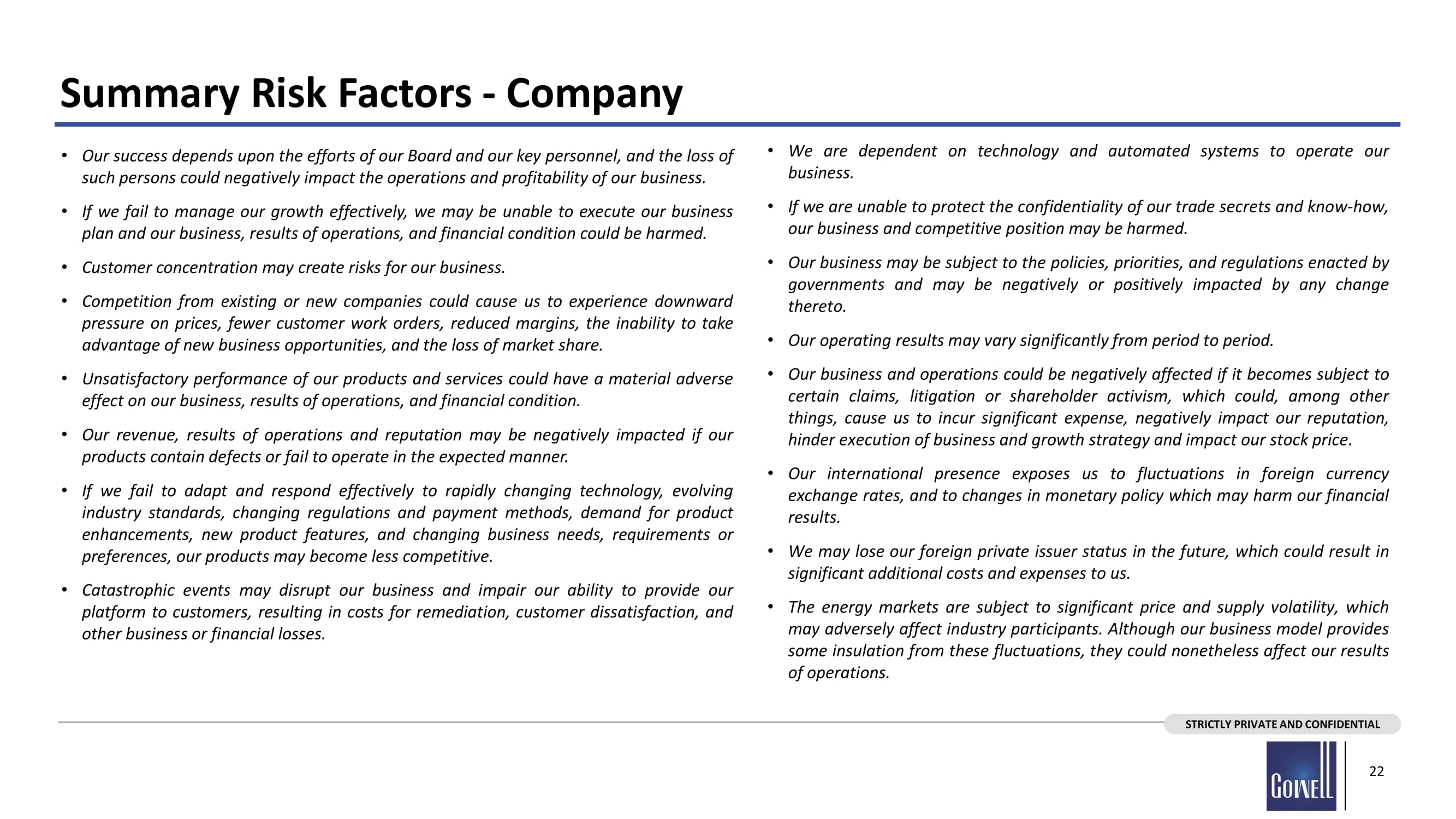 STRICTLY PRIVATE AND CONFIDENTIAL Summary Risk Factors - Company • Our success depends upon the efforts of our Board and our key personnel, and the loss of such persons could negatively impact the operations and profitability of our business. • If we fail to manage our growth effectively, we may be unable to execute our business plan and our business, results of operations, and financial condition could be harmed. • Customer concentration may create risks for our business. • Competition from existing or new companies could cause us to experience downward pressure on prices, fewer customer work orders, reduced margins, the inability to take advantage of new business opportunities, and the loss of market share. • Unsatisfactory performance of our products and services could have a material adverse effect on our business, results of operations, and financial condition. • Our revenue, results of operations and reputation may be negatively impacted if our products contain defects or fail to operate in the expected manner. • If we fail to adapt and respond effectively to rapidly changing technology, evolving industry standards, changing regulations and payment methods, demand for product enhancements, new product features, and changing business needs, requirements or preferences, our products may become less competitive. • Catastrophic events may disrupt our business and impair our ability to provide our platform to customers, resulting in costs for remediation, customer dissatisfaction, and other business or financial losses. • We are dependent on technology and automated systems to operate our business. • If we are unable to protect the confidentiality of our trade secrets and know - how, our business and competitive position may be harmed. • Our business may be subject to the policies, priorities, and regulations enacted by governments and may be negatively or positively impacted by any change thereto. • Our operating results may vary significantly from period to period. • Our business and operations could be negatively affected if it becomes subject to certain claims, litigation or shareholder activism, which could, among other things, cause us to incur significant expense, negatively impact our reputation, hinder execution of business and growth strategy and impact our stock price. • Our international presence exposes us to fluctuations in foreign currency exchange rates, and to changes in monetary policy which may harm our financial results. • We may lose our foreign private issuer status in the future, which could result in significant additional costs and expenses to us. • The energy markets are subject to significant price and supply volatility, which may adversely affect industry participants. Although our business model provides some insulation from these fluctuations, they could nonetheless affect our results of operations. 22