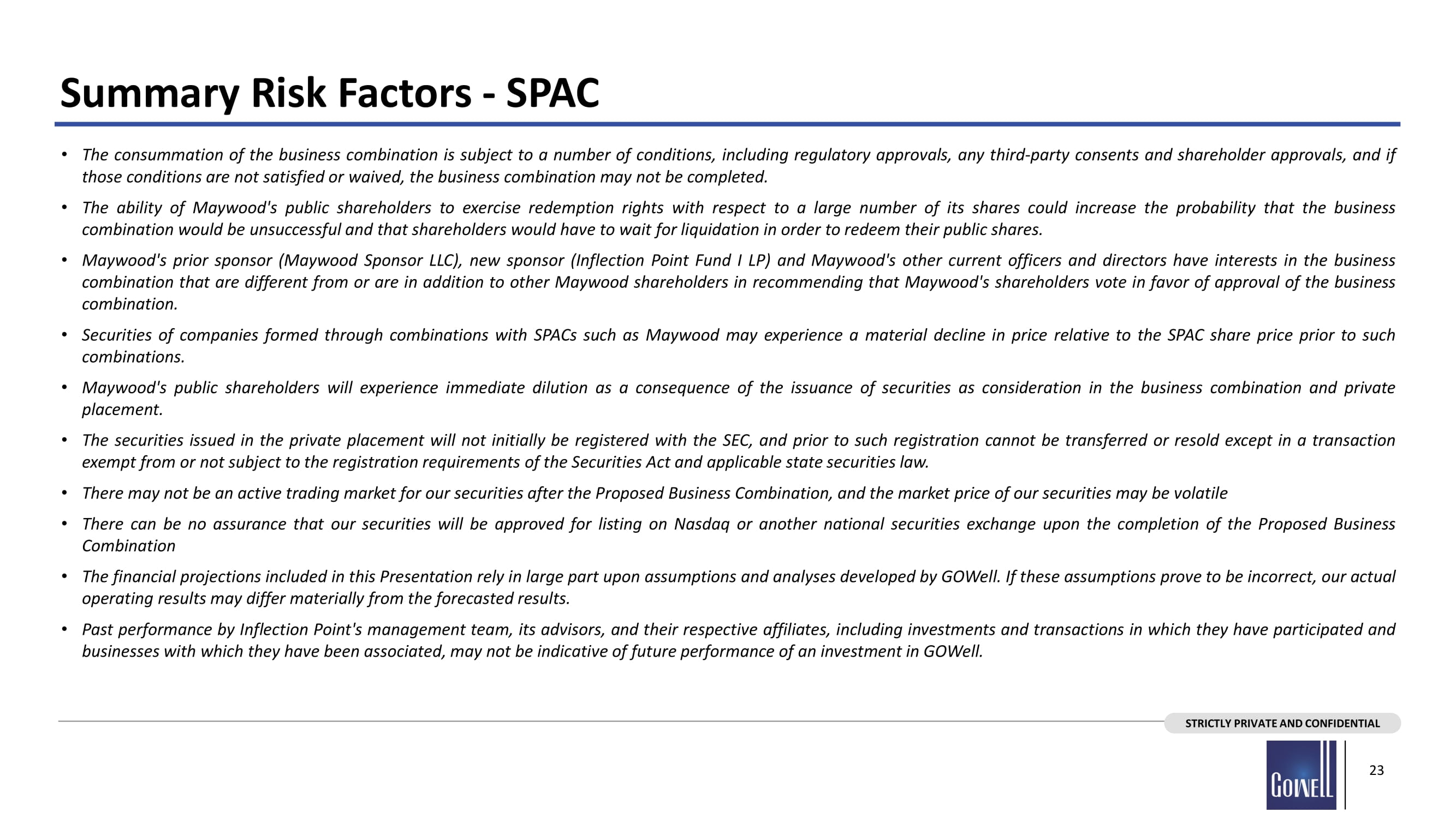 STRICTLY PRIVATE AND CONFIDENTIAL Summary Risk Factors - SPAC • The consummation of the business combination is subject to a number of conditions, including regulatory approvals, any third - party consents and shareholder approvals, and if those conditions are not satisfied or waived, the business combination may not be completed. • The ability of Maywood's public shareholders to exercise redemption rights with respect to a large number of its shares could increase the probability that the business combination would be unsuccessful and that shareholders would have to wait for liquidation in order to redeem their public sh are s. • Maywood's prior sponsor (Maywood Sponsor LLC), new sponsor (Inflection Point Fund I LP) and Maywood's other current officers and directors have interests in the business combination that are different from or are in addition to other Maywood shareholders in recommending that Maywood's sharehold ers vote in favor of approval of the business combination. • Securities of companies formed through combinations with SPACs such as Maywood may experience a material decline in price rel ative to the SPAC share price prior to such combinations. • Maywood's public shareholders will experience immediate dilution as a consequence of the issuance of securities as considerat ion in the business combination and private placement. • The securities issued in the private placement will not initially be registered with the SEC, and prior to such registration cannot be transferred or resold except in a transaction exempt from or not subject to the registration requirements of the Securities Act and applicable state securities law. • There may not be an active trading market for our securities after the Proposed Business Combination, and the market price of our securities may be volatile • There can be no assurance that our securities will be approved for listing on Nasdaq or another national securities exchange upon the completion of the Proposed Business Combination • The financial projections included in this Presentation rely in large part upon assumptions and analyses developed by GOWell. If these assumptions prove to be incorrect, our actual operating results may differ materially from the forecasted results. • Past performance by Inflection Point's management team, its advisors, and their respective affiliates, including investments and transactions in which they have participated and businesses with which they have been associated, may not be indicative of future performance of an investment in GOWell. 23