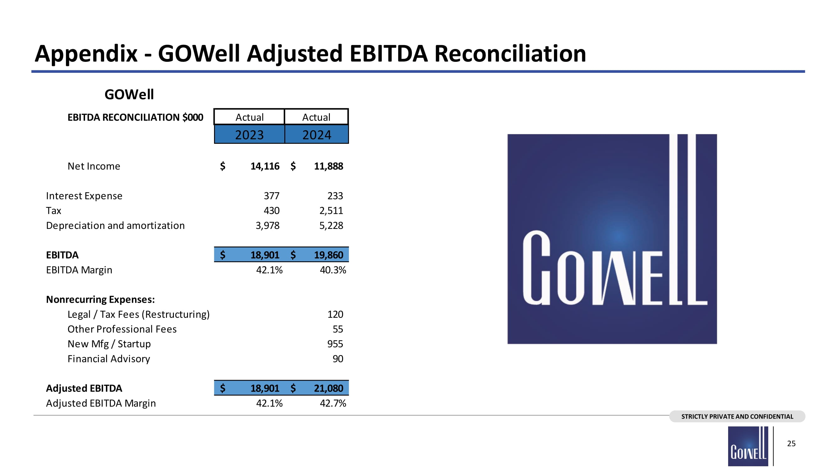 STRICTLY PRIVATE AND CONFIDENTIAL Appendix - GOWell Adjusted EBITDA Reconciliation 25 EBITDA RECONCILIATION $000 Actual Actual 2023 2024 Net Income 14,116 $ 11,888 $ Interest Expense 377 233 Tax 430 2,511 Depreciation and amortization 3,978 5,228 EBITDA 18,901 $ 19,860 $ EBITDA Margin 42.1% 40.3% Nonrecurring Expenses: Legal / Tax Fees (Restructuring) 120 Other Professional Fees 55 New Mfg / Startup 955 Financial Advisory 90 Adjusted EBITDA 18,901 $ 21,080 $ Adjusted EBITDA Margin 42.1% 42.7% GOWell