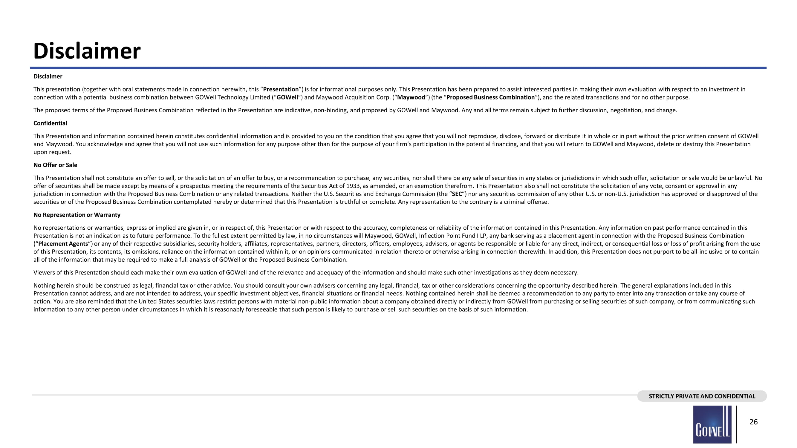 STRICTLY PRIVATE AND CONFIDENTIAL Disclaimer 26 Disclaimer This presentation (together with oral statements made in connection herewith, this “ Presentation ”) is for informational purposes only. This Presentation has been prepared to assist interested parties in making their own e val uation with respect to an investment in connection with a potential business combination between GOWell Technology Limited (“ GOWell ”) and Maywood Acquisition Corp. (“ Maywood ”) (the “ Proposed Business Combination ”), and the related transactions and for no other purpose. The proposed terms of the Proposed Business Combination reflected in the Presentation are indicative, non - binding, and proposed by GOWell and Maywood. Any and all terms remain subject to further discussion, negotiation, and change. Confidential This Presentation and information contained herein constitutes confidential information and is provided to you on the conditi on that you agree that you will not reproduce, disclose, forward or distribute it in whole or in part without the prior written con sent of GOWell and Maywood. You acknowledge and agree that you will not use such information for any purpose other than for the purpose of y our firm’s participation in the potential financing, and that you will return to GOWell and Maywood, delete or destroy this Prese nt ation upon request. No Offer or Sale This Presentation shall not constitute an offer to sell, or the solicitation of an offer to buy, or a recommendation to purch ase , any securities, nor shall there be any sale of securities in any states or jurisdictions in which such offer, solicitation or sale would be unlawful. No offer of securities shall be made except by means of a prospectus meeting the requirements of the Securities Act of 1933, as ame nded, or an exemption therefrom. This Presentation also shall not constitute the solicitation of any vote, consent or approva l i n any jurisdiction in connection with the Proposed Business Combination or any related transactions. Neither the U.S. Securities an d E xchange Commission (the “ SEC ”) nor any securities commission of any other U.S. or non - U.S. jurisdiction has approved or disapproved of the securities or of the Proposed Business Combination contemplated hereby or determined that this Presentation is truthful or co mpl ete. Any representation to the contrary is a criminal offense. No Representation or Warranty No representations or warranties, express or implied are given in, or in respect of, this Presentation or with respect to the ac curacy, completeness or reliability of the information contained in this Presentation. Any information on past performance co nta ined in this Presentation is not an indication as to future performance. To the fullest extent permitted by law, in no circumstances will May wood, GOWell, Inflection Point Fund I LP, any bank serving as a placement agent in connection with the Proposed Business Comb ina tion (“ Placement Agents ”) or any of their respective subsidiaries, security holders, affiliates, representatives, partners, directors, officers, emp loy ees, advisers, or agents be responsible or liable for any direct, indirect, or consequential loss or loss of profit arising f rom the use of this Presentation, its contents, its omissions, reliance on the information contained within it, or on opinions communicat ed in relation thereto or otherwise arising in connection therewith. In addition, this Presentation does not purport to be all - incl usive or to contain all of the information that may be required to make a full analysis of GOWell or the Proposed Business Combination. Viewers of this Presentation should each make their own evaluation of GOWell and of the relevance and adequacy of the informa tio n and should make such other investigations as they deem necessary. Nothing herein should be construed as legal, financial tax or other advice. You should consult your own advisers concerning a ny legal, financial, tax or other considerations concerning the opportunity described herein. The general explanations included in this Presentation cannot address, and are not intended to address, your specific investment objectives, financial situations or fi nan cial needs. Nothing contained herein shall be deemed a recommendation to any party to enter into any transaction or take any cou rse of action. You are also reminded that the United States securities laws restrict persons with material non - public information about a company obtained directly or indirectly from GOWell from purchasing or selling securities of such company, or from communic at ing such information to any other person under circumstances in which it is reasonably foreseeable that such person is likely to purch ase or sell such securities on the basis of such information.