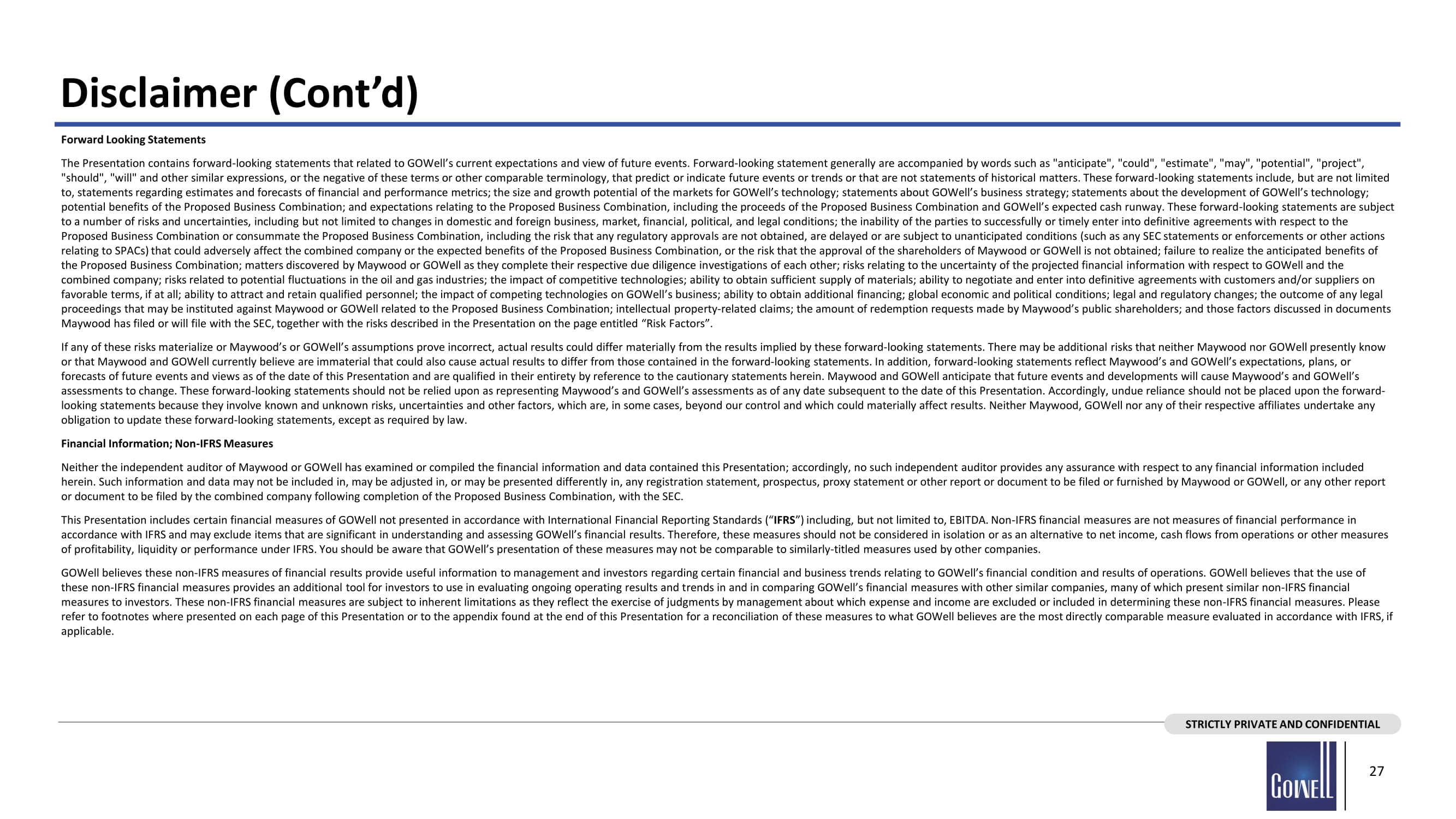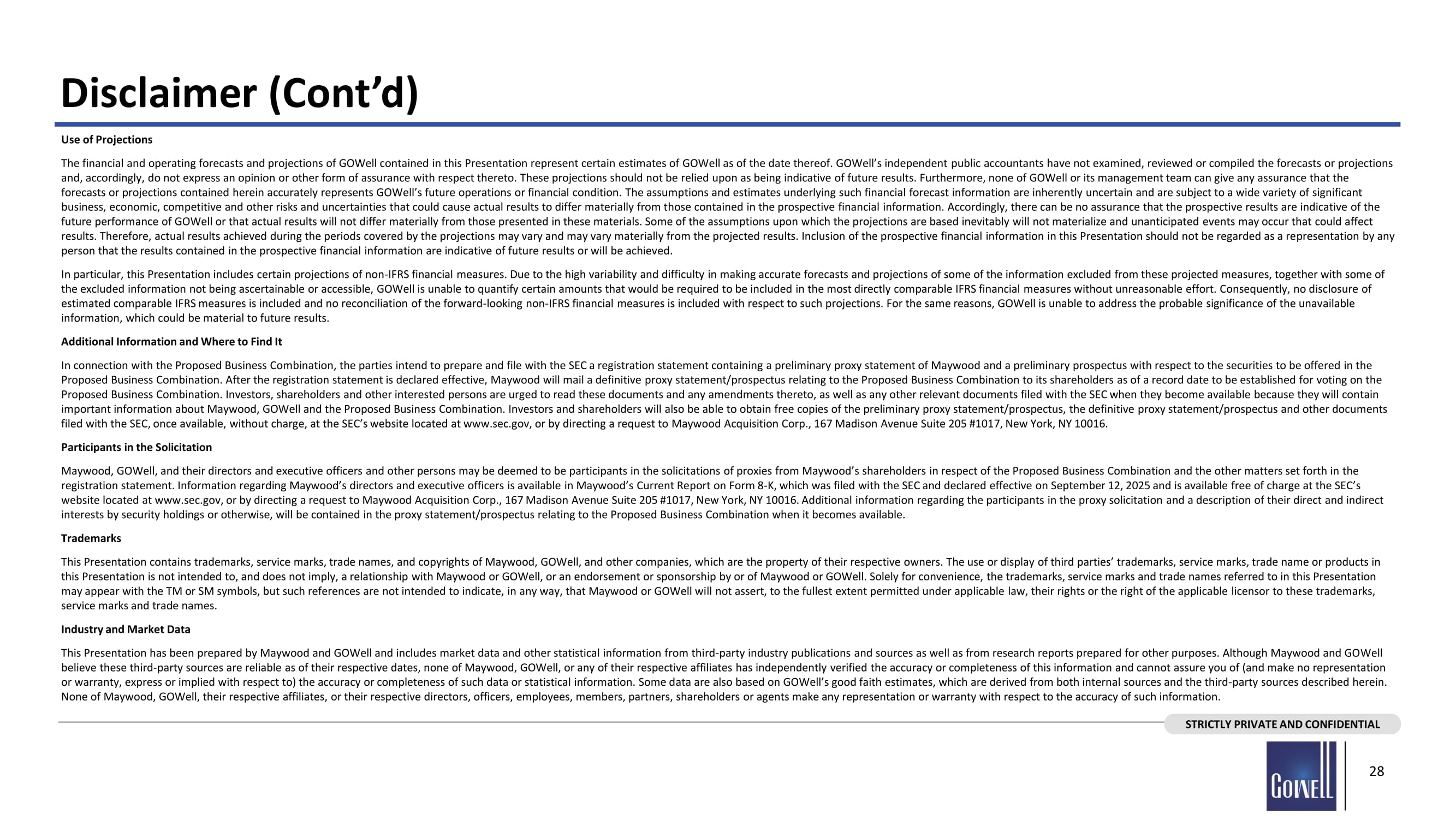 STRICTLY PRIVATE AND CONFIDENTIAL Disclaimer (Cont’d) 27 Forward Looking Statements The Presentation contains forward - l o o k i n g s t a t e m e n t s t h a t r e l a t e d t o G O W e l l ’ s c u r r e n t e x p e c t a t i o n s a n d v i e w o f f u t u r e e v e n t s . F orward - looking statement generally are accompanied by words such as "anticipate", "could", "estimate", "may", "potential", "proj ect", "should", "will" and other similar expressions, or the negative of these terms or other comparable terminology, that predict or indicate future events or trends or that are not statements of historical matters. These forward - looking statements include, but are not limited to, statements regarding estimates and forecasts of financial and performance metrics; the size and growth potential of the m ark e t s f o r G O W e l l ’ s t e c h n o l o g y ; s t a t e m e n t s a b o u t G O W e l l ’ s b u s i n e s s s t r a t e g y ; s t a t e m e n t s a b o u t t h e d e v e l o p m e n t o f G O W e l l ’ s t e c h n ology; potential benefits of the Proposed Business Combination; and expectations relating to the Proposed Business Combination, incl udi n g t h e p r o c e e d s o f t h e P r o p o s e d B u s i n e s s C o m b i n a t i o n a n d G O W e l l ’ s e x p e c t e d c a s h r u n w a y . T h e s e f o r w a r d - looking statements are subject to a number of risks and uncertainties, including but not limited to changes in domestic and foreign business, market, financ ial , political, and legal conditions; the inability of the parties to successfully or timely enter into definitive agreements wi th respect to the Proposed Business Combination or consummate the Proposed Business Combination, including the risk that any regulatory approva ls are not obtained, are delayed or are subject to unanticipated conditions (such as any SEC statements or enforcements or other ac tions relating to SPACs) that could adversely affect the combined company or the expected benefits of the Proposed Business Combina tio n, or the risk that the approval of the shareholders of Maywood or GOWell is not obtained; failure to realize the anticipated be nefits of the Proposed Business Combination; matters discovered by Maywood or GOWell as they complete their respective due diligence in ves tigations of each other; risks relating to the uncertainty of the projected financial information with respect to GOWell and the combined company; risks related to potential fluctuations in the oil and gas industries; the impact of competitive technologi es; ability to obtain sufficient supply of materials; ability to negotiate and enter into definitive agreements with customers an d/ or suppliers on favorable terms, if at all; ability to attract and retain qualified personnel; the impact of competing technologies on GOWell ’ s business; ability to obtain additional financing; global economic and political conditions; legal and regulatory changes; the ou tcome of any legal proceedings that may be instituted against Maywood or GOWell related to the Proposed Business Combination; intellectual prope rty - r e l a t e d c l a i m s ; t h e a m o u n t o f r e d e m p t i o n r e q u e s t s m a d e b y M a y w o o d ’ s p u b l i c s h a r e h o l d e r s ; a n d t h o s e f a c t o r s d i s c u s s e d i n d o c u ments M a y w o o d h a s f i l e d o r w i l l f i l e w i t h t h e S E C , t o g e t h e r w i t h t h e r i s k s d e s c r i b e d i n t h e P r e s e n t a t i o n o n t h e p a g e e n t i t l e d “ R i s k Fa c t o r s ” . I f a n y o f t h e s e r i s k s m a t e r i a l i z e o r M a y w o o d ’ s o r G O W e l l ’ s a s s u m p t i o n s p r o v e i n c o r r e c t , a c t u a l r e s u l t s c o u l d d i f f e r m a t e r i a l ly from the results implied by these forward - looking statements. There may be additional risks that neither Maywood nor GOWell p resently know or that Maywood and GOWell currently believe are immaterial that could also cause actual results to differ from those contain ed in the forward - looking statements. In addition, forward - l o o k i n g s t a t e m e n t s r e f l e c t M a y w o o d ’ s a n d G O W e l l ’ s e x p e c t a t i o n s , p l a n s , or forecasts of future events and views as of the date of this Presentation and are qualified in their entirety by reference to the c a u t i o n a r y s t a t e m e n t s h e r e i n . M a y w o o d a n d G O W e l l a n t i c i p a t e t h a t f u t u r e e v e n t s a n d d e v e l o p m e n t s w i l l c a u s e M a y w o o d ’ s a n d G O W ell ’ s assessments to change. These forward - l o o k i n g s t a t e m e n t s s h o u l d n o t b e r e l i e d u p o n a s r e p r e s e n t i n g M a y w o o d ’ s a n d G O W e l l ’ s a s s e s s ments as of any date subsequent to the date of this Presentation. Accordingly, undue reliance should not be placed upon the f orw ard - looking statements because they involve known and unknown risks, uncertainties and other factors, which are, in some cases, b eyo nd our control and which could materially affect results. Neither Maywood, GOWell nor any of their respective affiliates unde rta ke any obligation to update these forward - looking statements, except as required by law. Financial Information; Non - IFRS Measures Neither the independent auditor of Maywood or GOWell has examined or compiled the financial information and data contained th is Presentation; accordingly, no such independent auditor provides any assurance with respect to any financial information inclu ded herein. Such information and data may not be included in, may be adjusted in, or may be presented differently in, any registr ati on statement, prospectus, proxy statement or other report or document to be filed or furnished by Maywood or GOWell, or any o the r report or document to be filed by the combined company following completion of the Proposed Business Combina