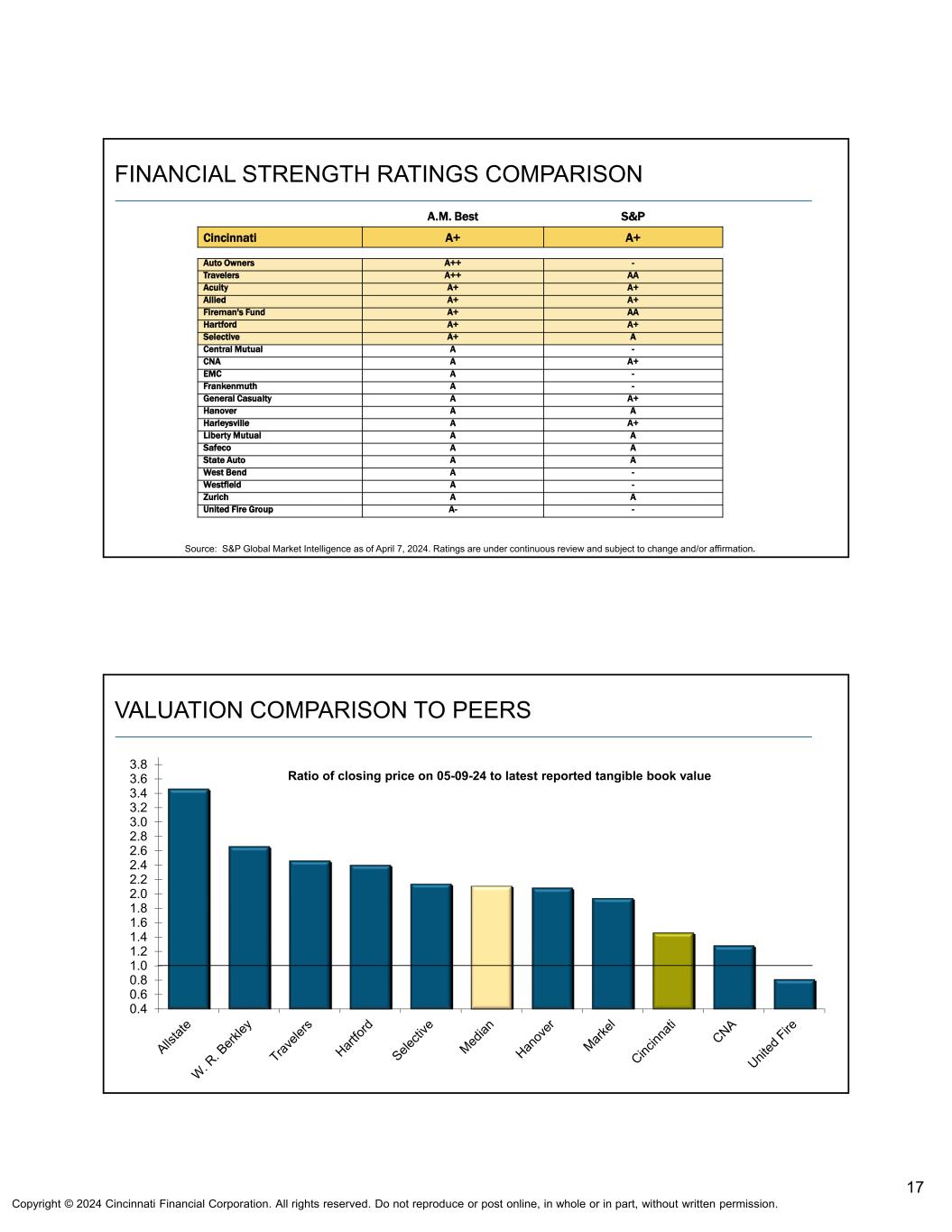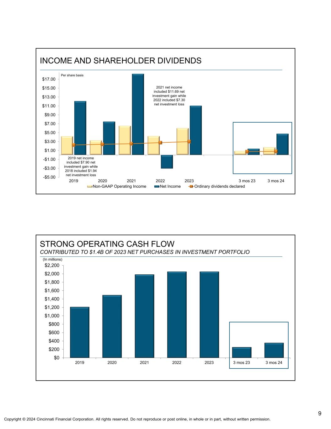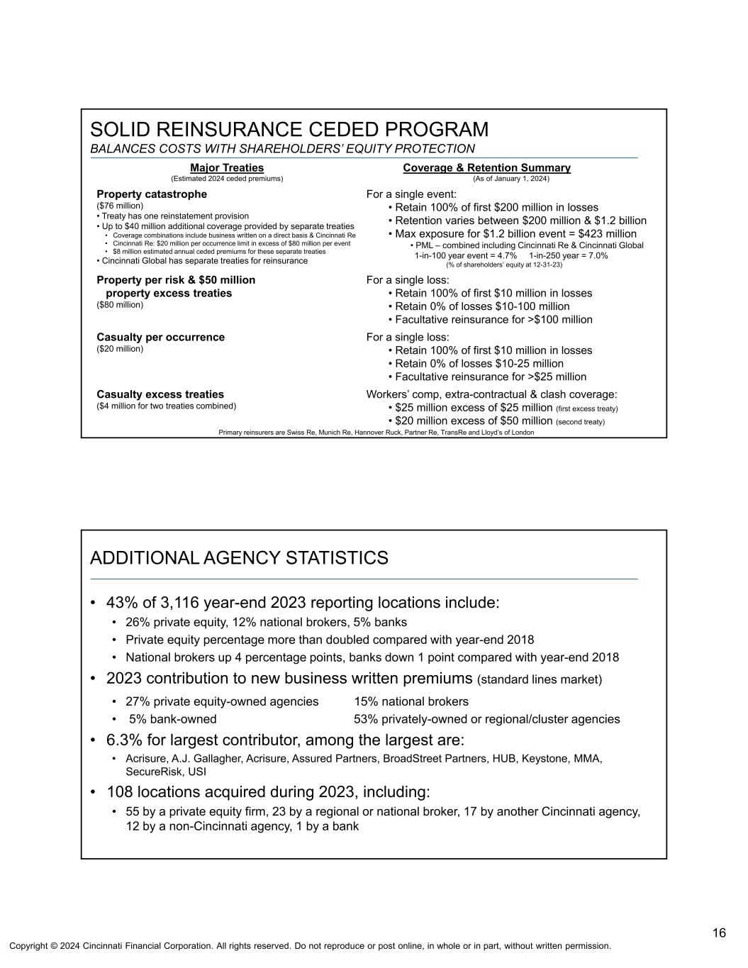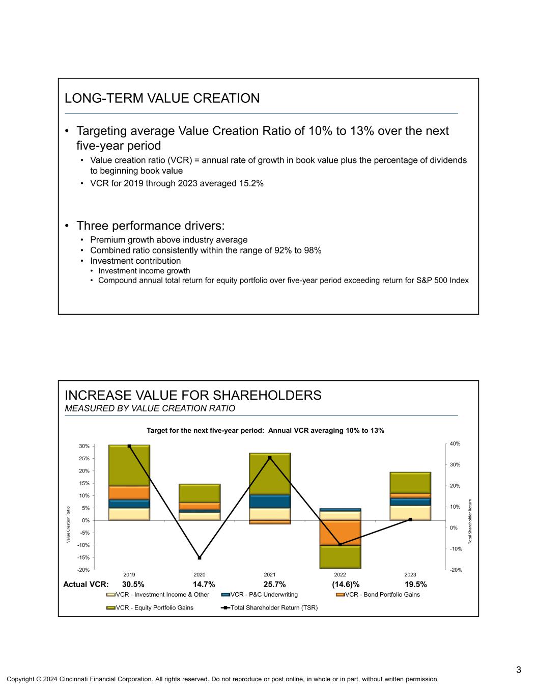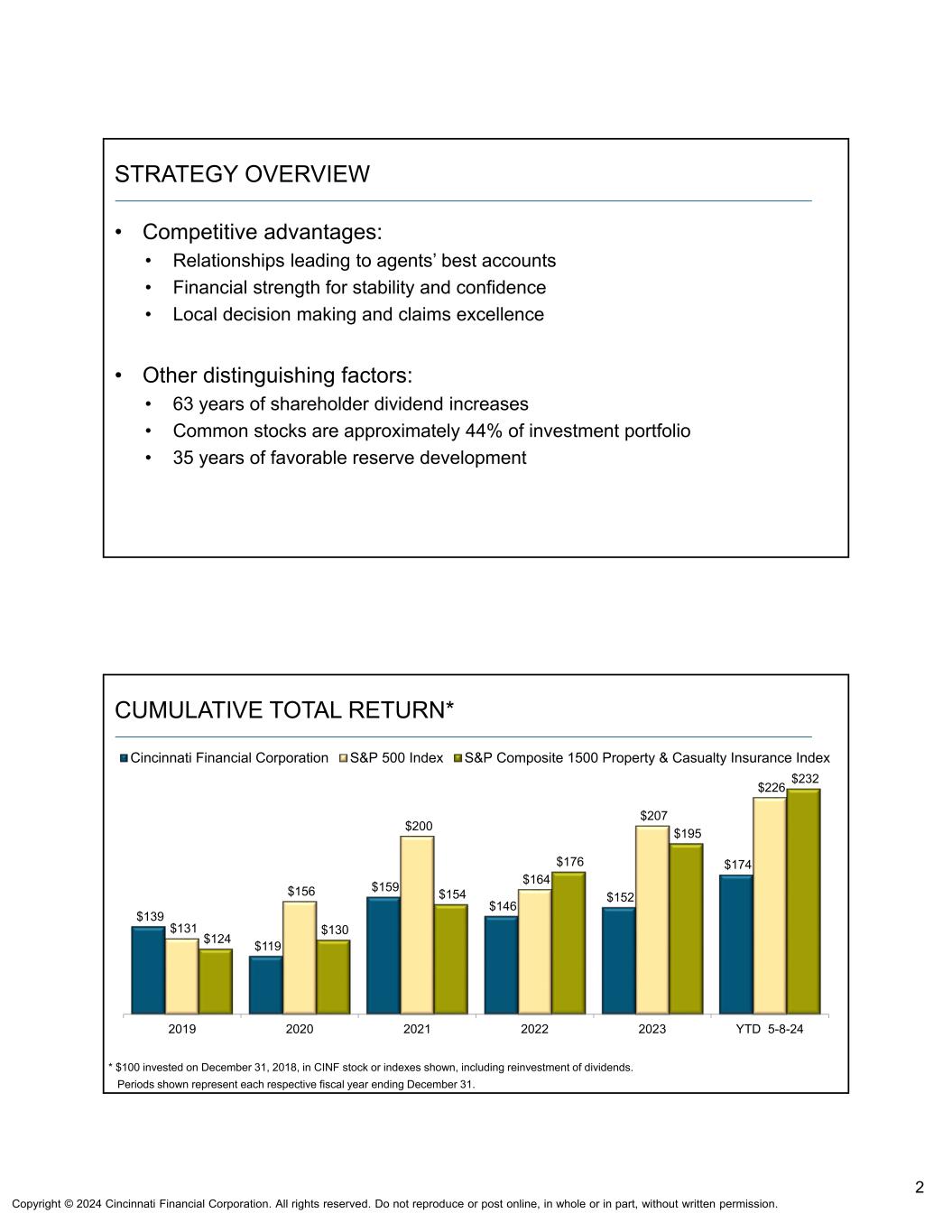 1 Copyright © 2024 Cincinnati Financial Corporation. All rights reserved. Do not reproduce or post online, in whole or in part, without written permission. INVESTOR HANDOUT MAY 2024 NASDAQ: CINF This presentation contains forward-looking statements that involve risks and uncertainties. Please refer to our various filings with the U.S. Securities and Exchange Commission for factors that could cause results to materially differ from those discussed. The forward-looking information in this presentation has been publicly disclosed, most recently on April 25, 2024, and should be considered to be effective only as of that date. Its inclusion in this document is not intended to be an update or reaffirmation of the forward-looking information as of any later date. Reconciliations of non-GAAP measures are in our most recent quarterly earnings news release, which is available at cinfin.com/investors.