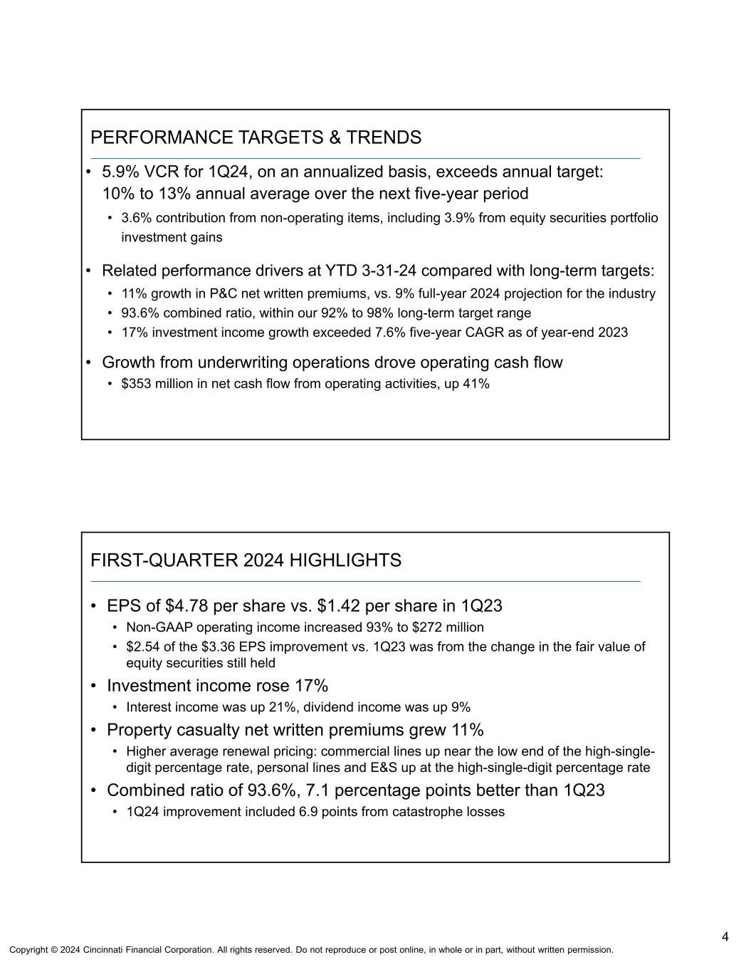 3 Copyright © 2024 Cincinnati Financial Corporation. All rights reserved. Do not reproduce or post online, in whole or in part, without written permission. LONG-TERM VALUE CREATION • Targeting average Value Creation Ratio of 10% to 13% over the next five-year period • Value creation ratio (VCR) = annual rate of growth in book value plus the percentage of dividends to beginning book value • VCR for 2019 through 2023 averaged 15.2% • Three performance drivers: • Premium growth above industry average • Combined ratio consistently within the range of 92% to 98% • Investment contribution • Investment income growth • Compound annual total return for equity portfolio over five-year period exceeding return for S&P 500 Index INCREASE VALUE FOR SHAREHOLDERS MEASURED BY VALUE CREATION RATIO -20% -10% 0% 10% 20% 30% 40% -20% -15% -10% -5% 0% 5% 10% 15% 20% 25% 30% 2019 2020 2021 2022 2023 VCR - Investment Income & Other VCR - P&C Underwriting VCR - Bond Portfolio Gains VCR - Equity Portfolio Gains Total Shareholder Return (TSR) Actual VCR: 30.5% 14.7% 25.7% (14.6)% 19.5% Target for the next five-year period: Annual VCR averaging 10% to 13% V al u e C re at io n R at io To ta l S h ar eh o ld er R et u rn