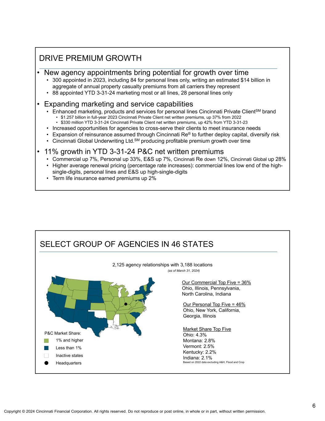 5 Copyright © 2024 Cincinnati Financial Corporation. All rights reserved. Do not reproduce or post online, in whole or in part, without written permission. STRATEGIES FOR LONG-TERM SUCCESS • Financial strength for consistent support to agencies • Diversified fixed-maturity portfolio, laddered maturity structure • No corporate exposure exceeded 0.8% of total bond portfolio at 3-31-24, no municipal exposure exceeded 0.2% • 43.7% of investment portfolio in common stocks to grow book value • No single security exceeded 8.4% of publicly traded common stock portfolio • Portfolio composition helps mitigate anticipated effects of inflation and a rise in interest rates • Low reliance on debt, with 6.1% debt-to-total-capital at 3-31-24 • Nonconvertible, noncallable debentures due in 2028 and 2034 • Capacity for growth with premiums-to-surplus at 1.0-to-1 • Operating structure reflects agency-centered model • Field focus – staffed for local decision making, agency support • Superior claims service and broad insurance product offerings • Profit improvement and premium growth initiatives MANAGE INSURANCE PROFITABILITY • Ongoing underwriting expertise enhancement • Predictive modeling tools and analytics to improve property casualty pricing precision and segmentation on an individual policy basis • Data management for better underwriting and more granular pricing decisions • Associate specialization and augmentation aimed at lowering loss ratios • Improving efficiencies and ease of use with technology • Streamlines processing for agencies and the company • Helps optimize personalized service • Investing for the future • To improve profitability with rate adequacy and risk selection/loss control initiatives • To diversify risk by expanding operations into new geographies and product areas • Strategic investments with modest short-term effects on expense ratios • 15% increase in field associates since the end of 2018, supporting healthy premium growth