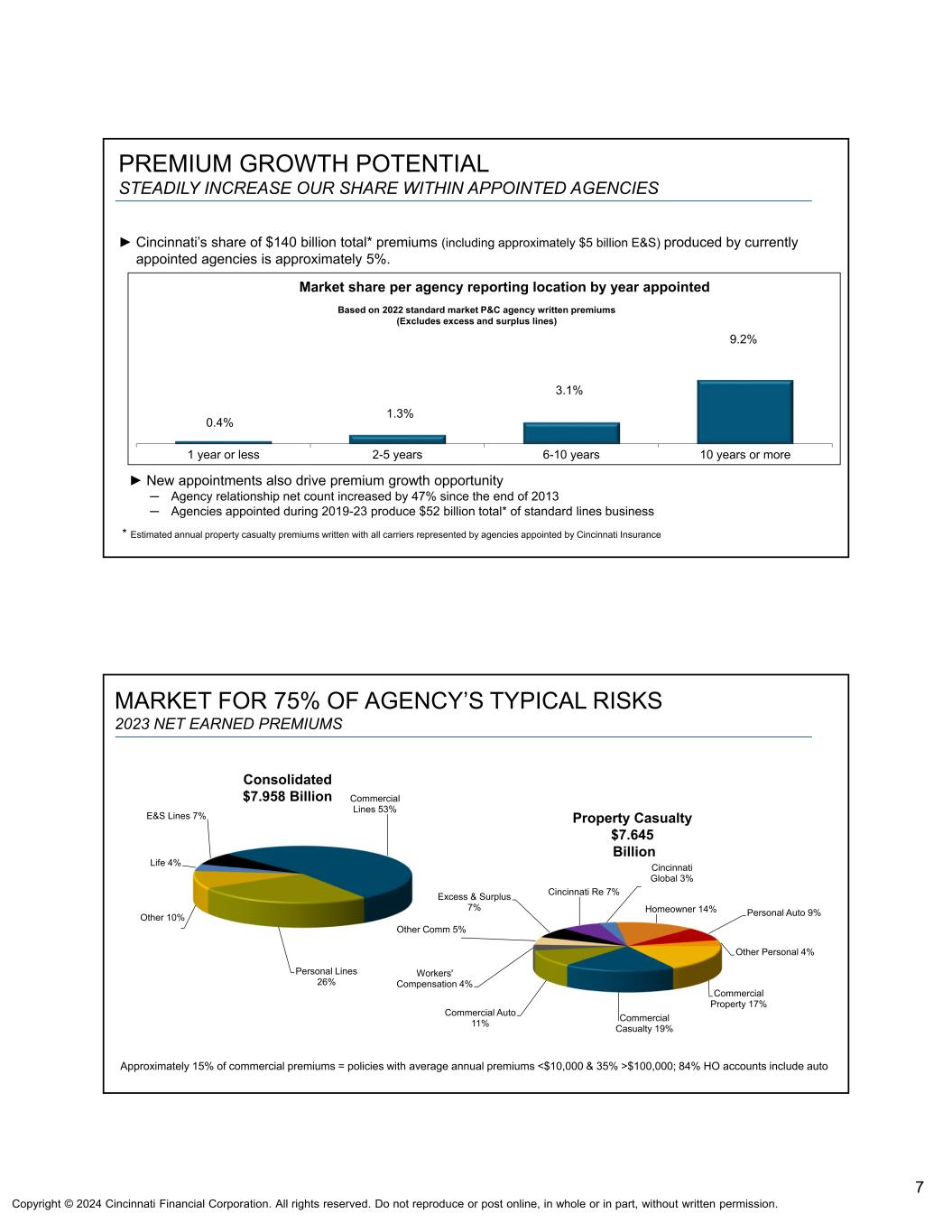 6 Copyright © 2024 Cincinnati Financial Corporation. All rights reserved. Do not reproduce or post online, in whole or in part, without written permission. DRIVE PREMIUM GROWTH • New agency appointments bring potential for growth over time • 300 appointed in 2023, including 84 for personal lines only, writing an estimated $14 billion in aggregate of annual property casualty premiums from all carriers they represent • 88 appointed YTD 3-31-24 marketing most or all lines, 28 personal lines only • Expanding marketing and service capabilities • Enhanced marketing, products and services for personal lines Cincinnati Private ClientSM brand • $1.257 billion in full-year 2023 Cincinnati Private Client net written premiums, up 37% from 2022 • $330 million YTD 3-31-24 Cincinnati Private Client net written premiums, up 42% from YTD 3-31-23 • Increased opportunities for agencies to cross-serve their clients to meet insurance needs • Expansion of reinsurance assumed through Cincinnati Re® to further deploy capital, diversify risk • Cincinnati Global Underwriting Ltd.SM producing profitable premium growth over time • 11% growth in YTD 3-31-24 P&C net written premiums • Commercial up 7%, Personal up 33%, E&S up 7%, Cincinnati Re down 12%, Cincinnati Global up 28% • Higher average renewal pricing (percentage rate increases): commercial lines low end of the high- single-digits, personal lines and E&S up high-single-digits • Term life insurance earned premiums up 2% SELECT GROUP OF AGENCIES IN 46 STATES P&C Market Share: 2,125 agency relationships with 3,188 locations Our Commercial Top Five = 36% Ohio, Illinois, Pennsylvania, North Carolina, Indiana Our Personal Top Five = 46% Ohio, New York, California, Georgia, Illinois 1% and higher Less than 1% Inactive states Headquarters (as of March 31, 2024) Market Share Top Five Ohio: 4.3% Montana: 2.8% Vermont: 2.5% Kentucky: 2.2% Indiana: 2.1% Based on 2022 data excluding A&H, Flood and Crop