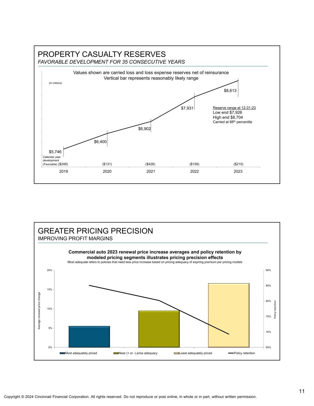 11 Copyright © 2024 Cincinnati Financial Corporation. All rights reserved. Do not reproduce or post online, in whole or in part, without written permission. PROPERTY CASUALTY RESERVES FAVORABLE DEVELOPMENT FOR 35 CONSECUTIVE YEARS $5,746 $6,400 $6,902 $7,931 $8,613 2019 2020 2021 2022 2023 Reserve range at 12-31-23 Low end $7,926 High end $8,704 Carried at 88th percentile (In millions) Values shown are carried loss and loss expense reserves net of reinsurance Vertical bar represents reasonably likely range Calendar year development (Favorable) ($248) ($131) ($428) ($159) ($215) GREATER PRICING PRECISION IMPROVING PROFIT MARGINS 65% 70% 75% 80% 85% 90% 0% 5% 10% 15% 20% Most adequately priced Near (+ or -) price adequacy Least adequately priced Policy retention P o lic y re te n ti o n A ve ra ge r e n e w al p ri ce c h an ge Commercial auto 2023 renewal price increase averages and policy retention by modeled pricing segments illustrates pricing precision effects Most adequate refers to policies that need less price increase based on pricing adequacy of expiring premium per pricing models