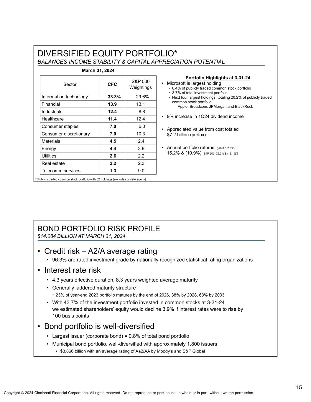 14 Copyright © 2024 Cincinnati Financial Corporation. All rights reserved. Do not reproduce or post online, in whole or in part, without written permission. INVESTMENT INCOME 17% GROWTH YTD 3-31-24: INTEREST UP 21%, DIVIDENDS UP 9% (PRETAX) $500 $550 $600 $650 $700 $750 $800 $850 $900 2019 2020 2021 2022 2023 (In millions) Pretax bond yield: 4.10% 4.06% 4.05% 4.05% 4.39% (Bonds at amortized cost) Pretax book yield for bonds acquired: 5.01% in 2022, 6.13% in 2023 Pretax book yield as of 12-31-23 for bonds maturing in 2024=4.36%, 2025=4.76%, 2026=4.94% Portion of bond portfolio maturing: 7.0% in 2024, 8.2% in 2025, 7.7% in 2026, 15.3% in 2027-28 INVESTMENT PORTFOLIO INVEST FOR INCOME AND APPRECIATION Taxable Fixed Maturities $10.218 Tax-Exempt Fixed Maturities $3.866 Common Equities $11.203 Preferred Equities $0.354 Investment leverage: 207% at March 31, 2024 Bond portfolio fair value exceeds insurance reserves liability by approximately 14% $25.6 billion fair value at March 31, 2024 (in billions)